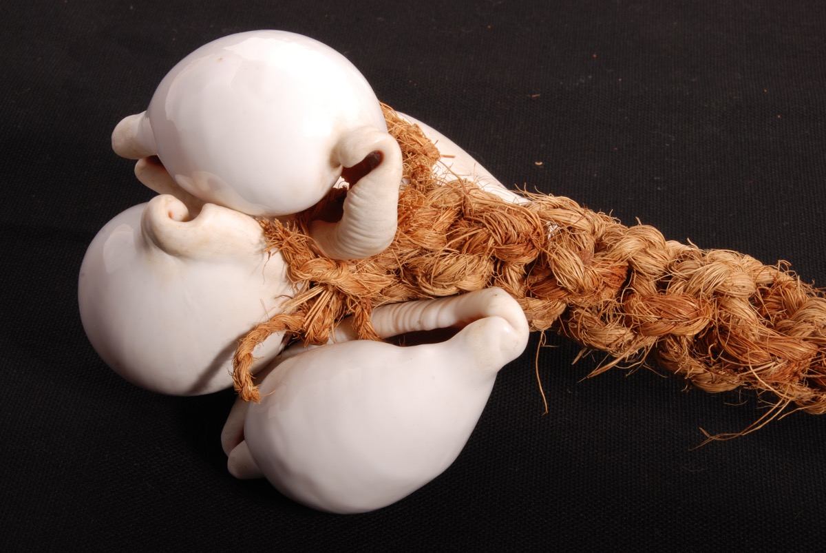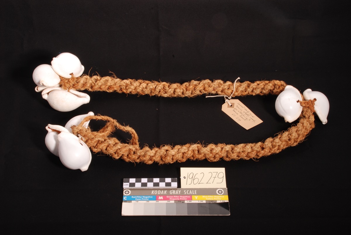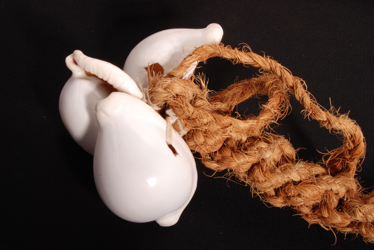 Coconut fibre cord with nine ovula ovum shells.