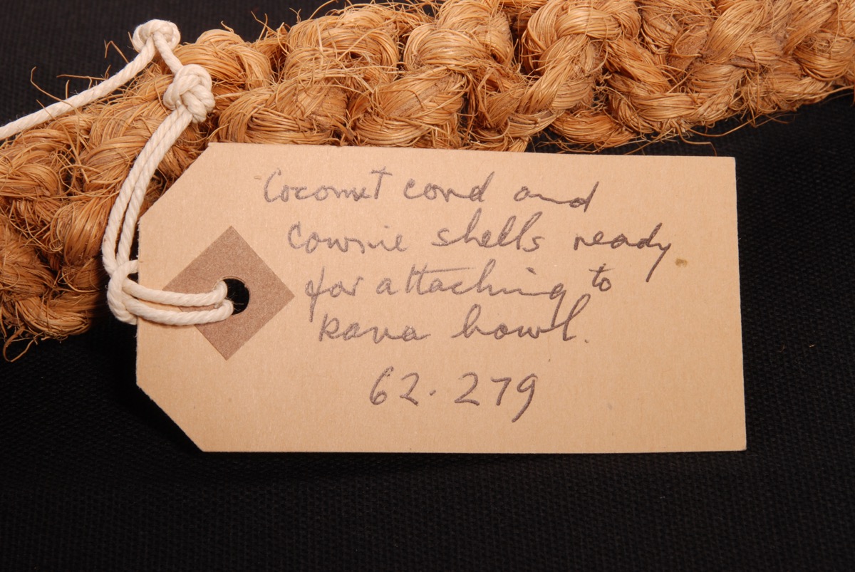 A label attached to the rope reads: [handwritten in black pen:] 'coconut cord and cowrie shells ready for attaching to kava bowl 62.279'.