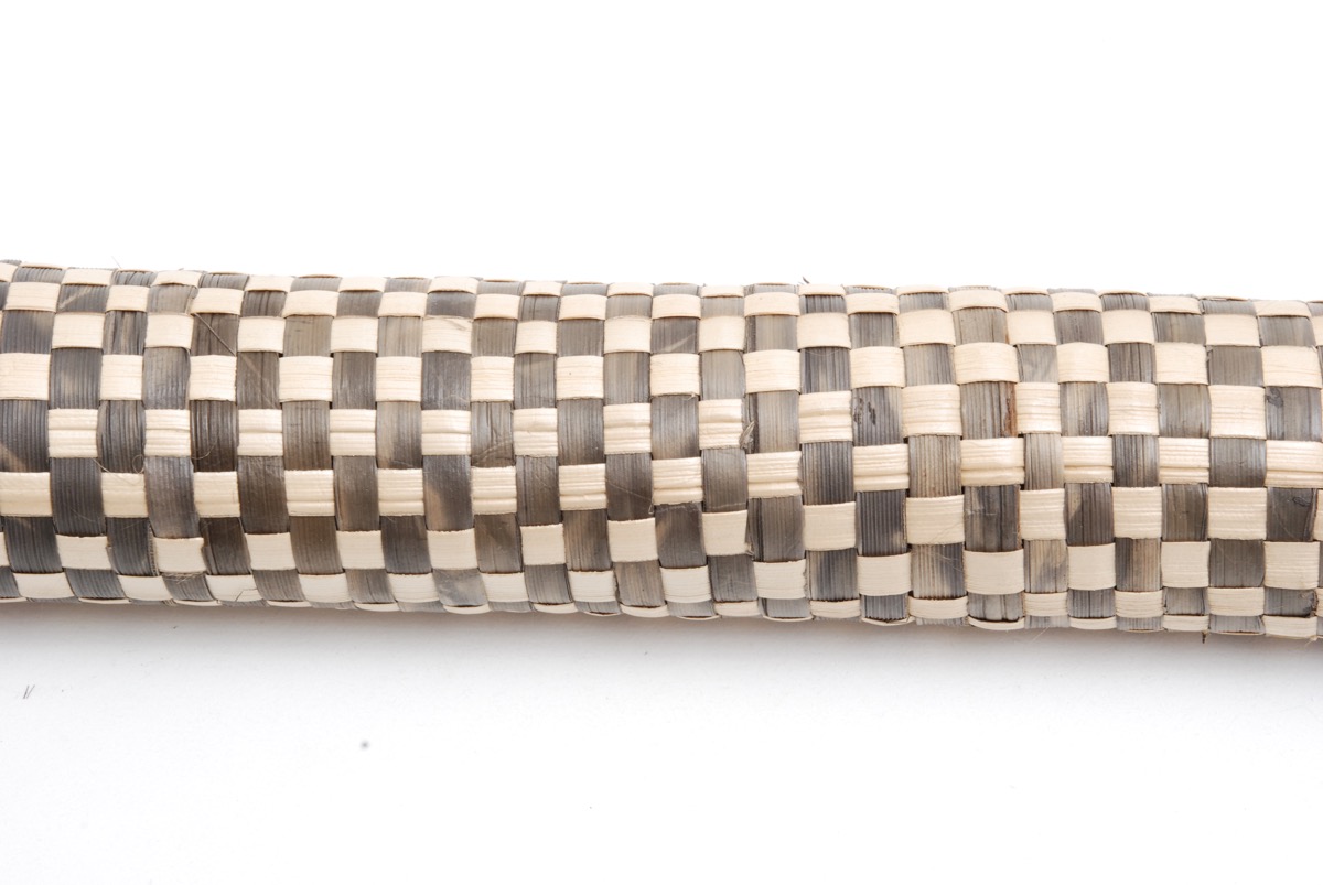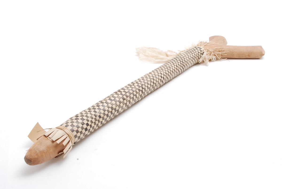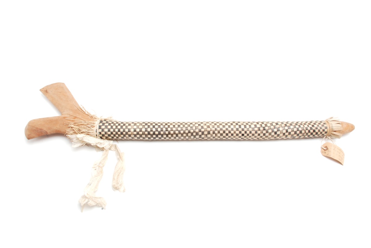 Club with shaft covered with black and white plaited pandanus and with white barkcloth streamer