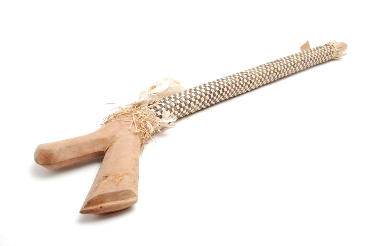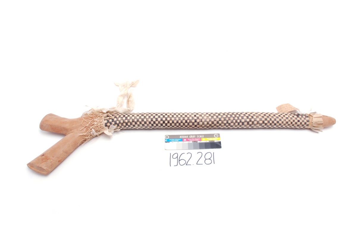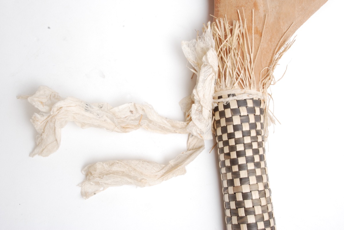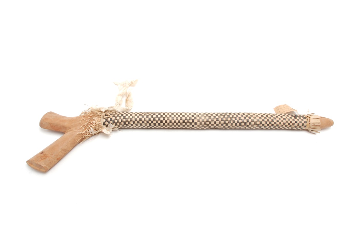 Club with shaft covered with black and white plaited pandanus and with white barkcloth streamer