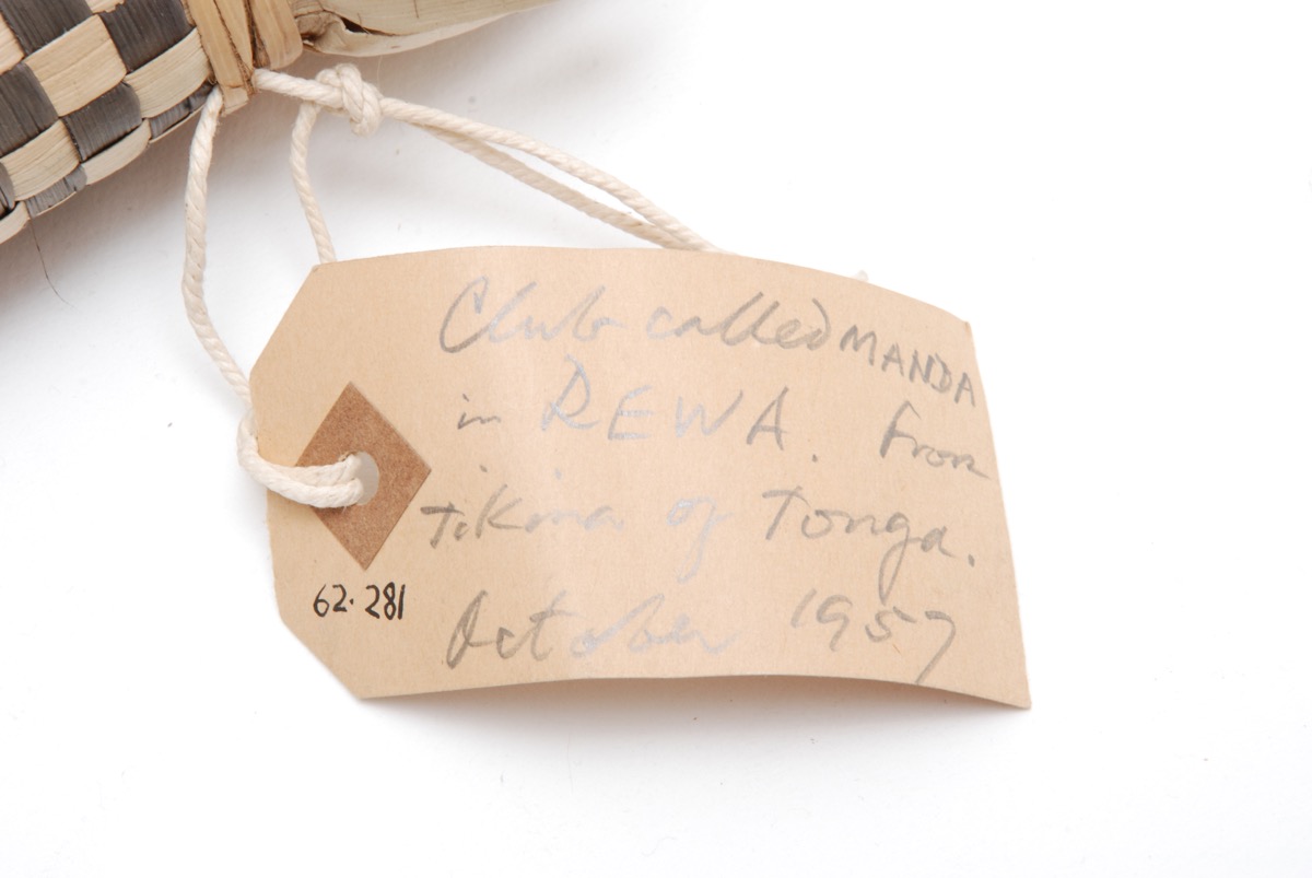 Labels & inscriptions: '62.281' inscribed in black ink on the butt. A large cream label is attached to the butt and reads [handwritten in pencil in G. K. Roth's handwritting:] 'Club called MANDA in REWA. From Tikina of Tonga. October 1957' and [added in black ink:] '62.281'.