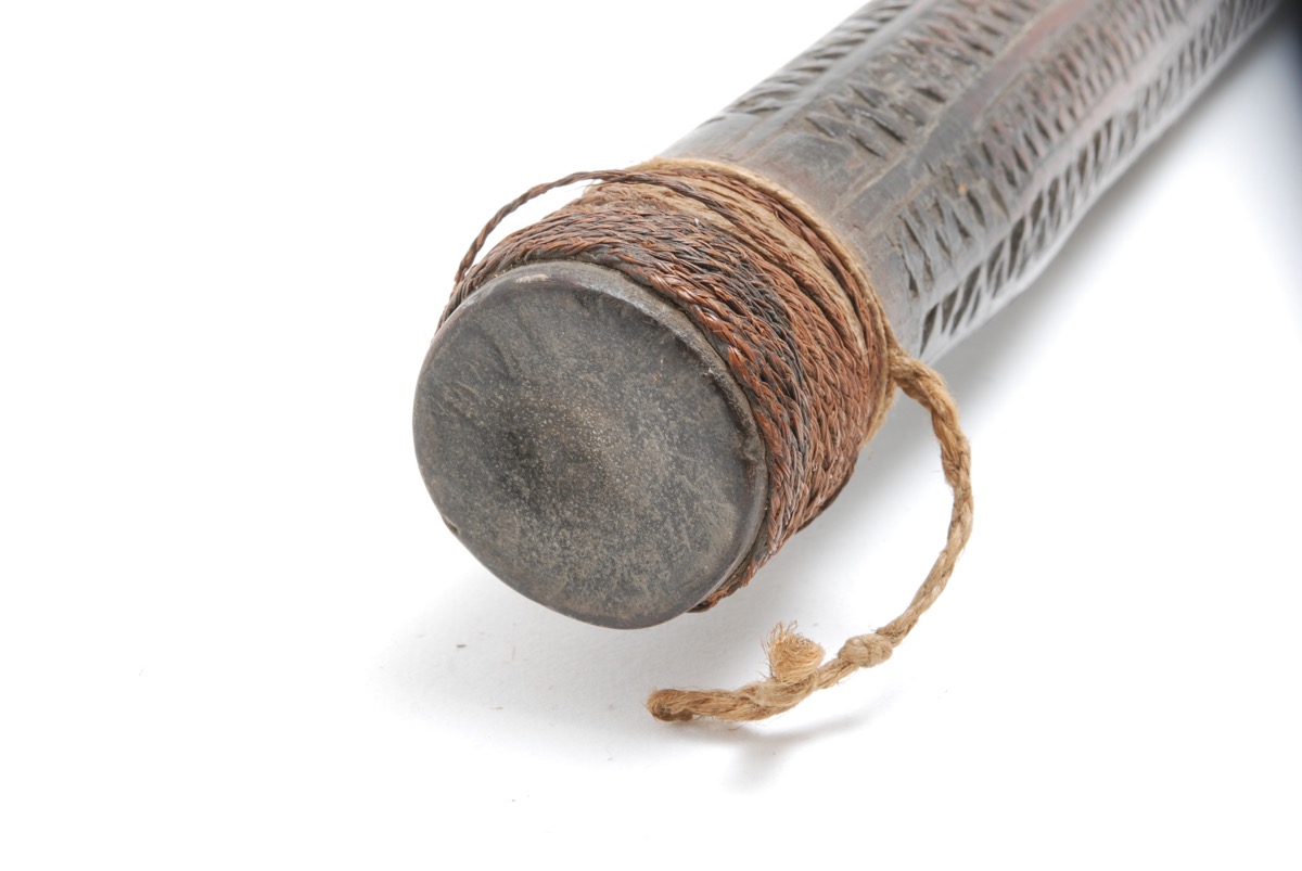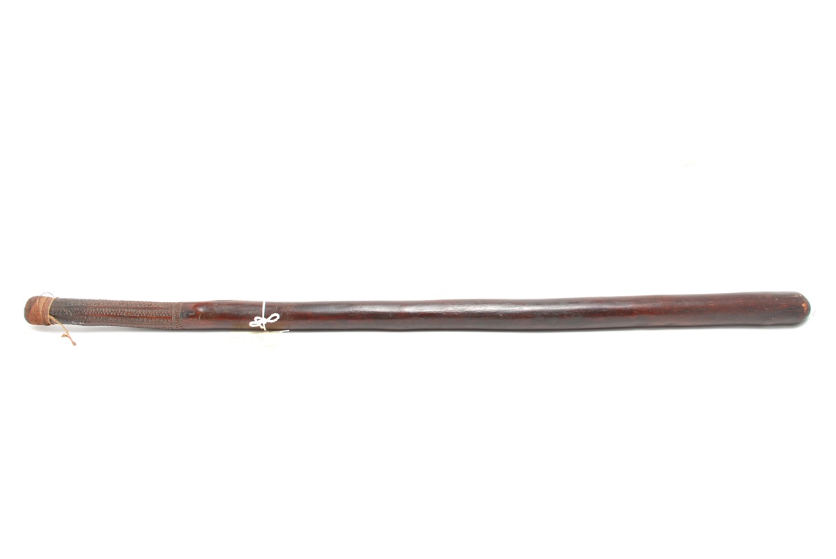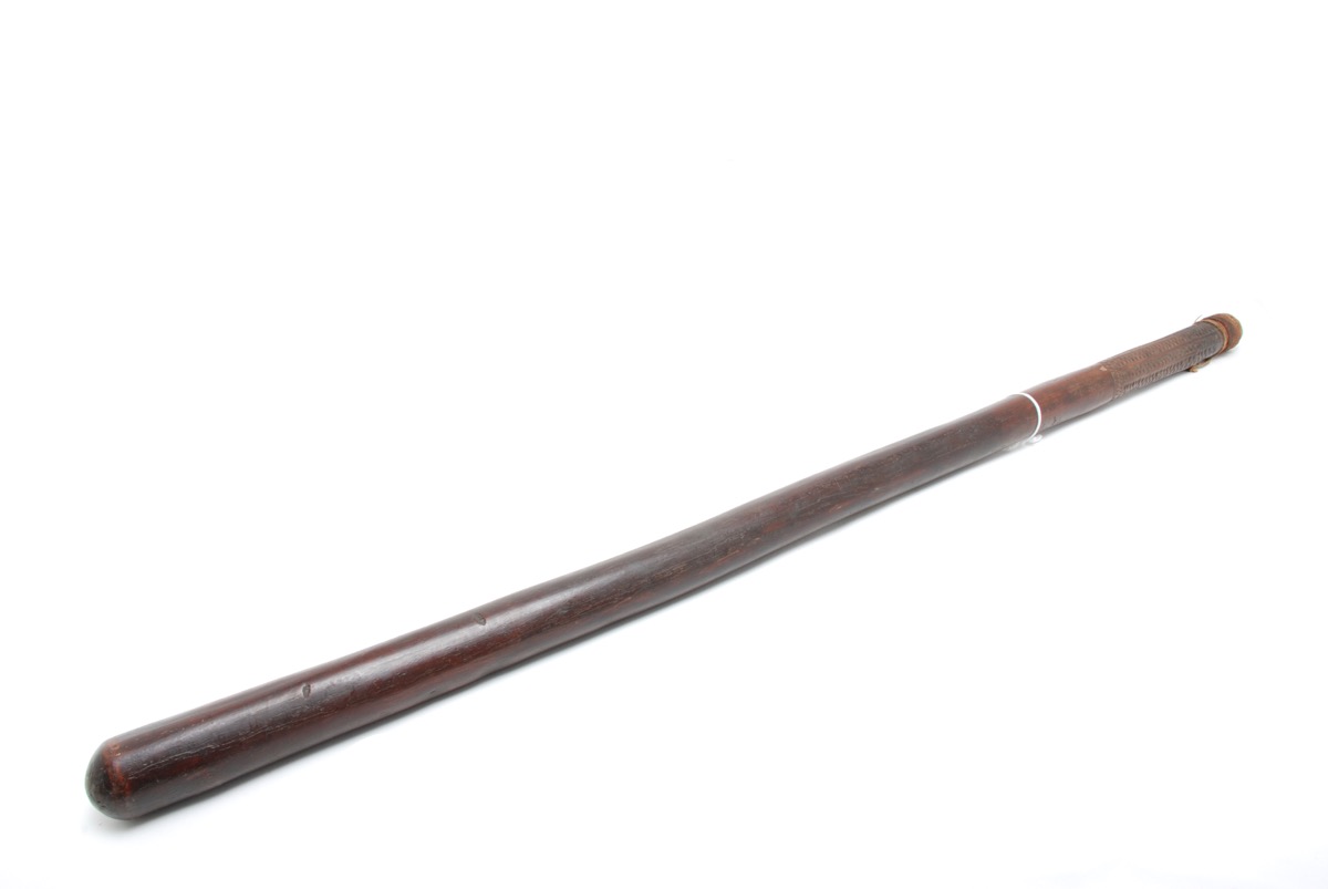 Pole club of heavy dark wood, possibly a cross between a gadi and a bowai. Partially bound with barkcloth and coir cords.