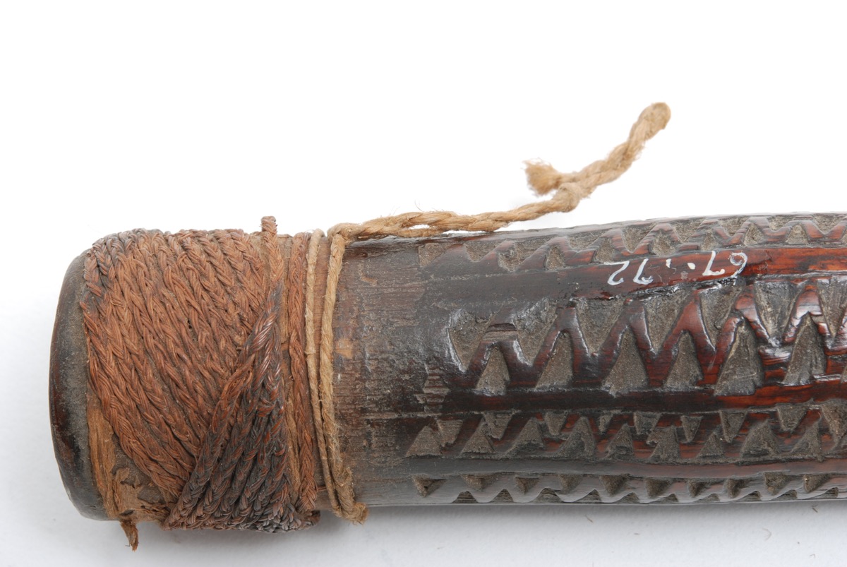 Pole club of heavy dark wood, possibly a cross between a gadi and a bowai. The head is flared and convex at the top. The shaft is circular in section with a slight bend in the wood due to a knot. The handle is carved with deep tavatava patterns. The lower part of the handle is bound with a thin layer of barkcloth and 3-ply plaited coir cords. A length of twisted vegetable fibre attached between the carved and the bound parts. The butt is concave (L.Carreau, 25/03/2013).
