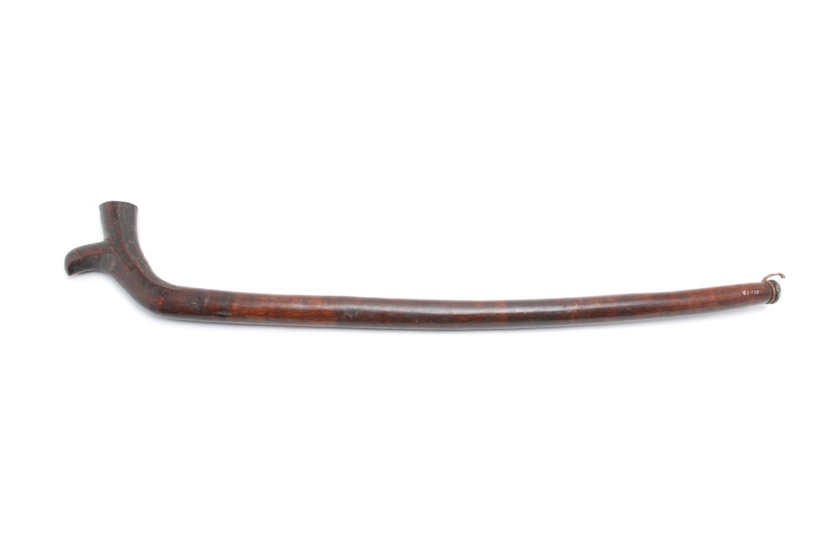 Spurred club of dark wood, gata. The head is curved and provided with a lip (tebetebe). The underside of the head is roughly carved to resemble the bark of a tree. The spur is rounded. A small rounded ridge (teretere) is carved at the junction between the head and the spur. The handle is circular in section and very polished. Small pommelled butt. A piece of European string is tied around the pommel.