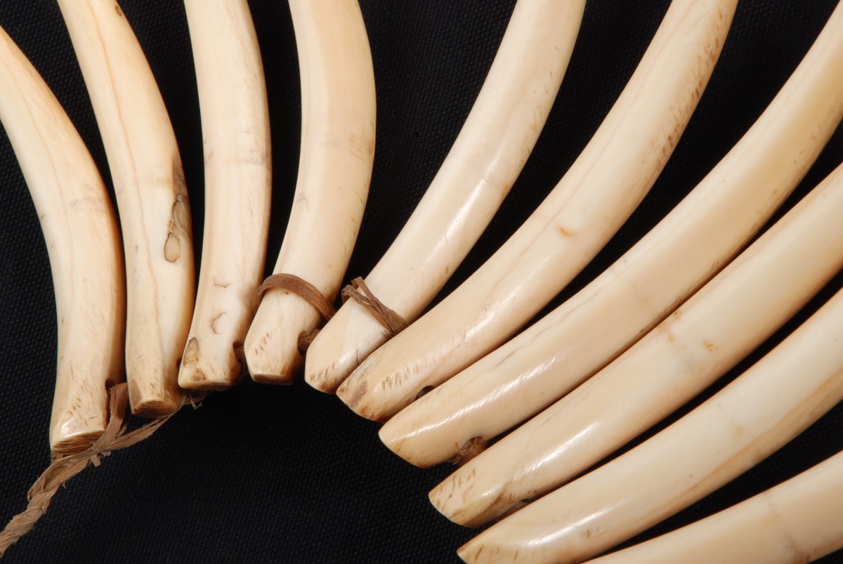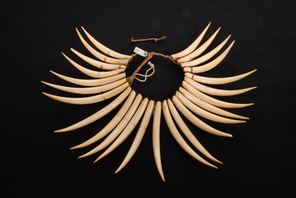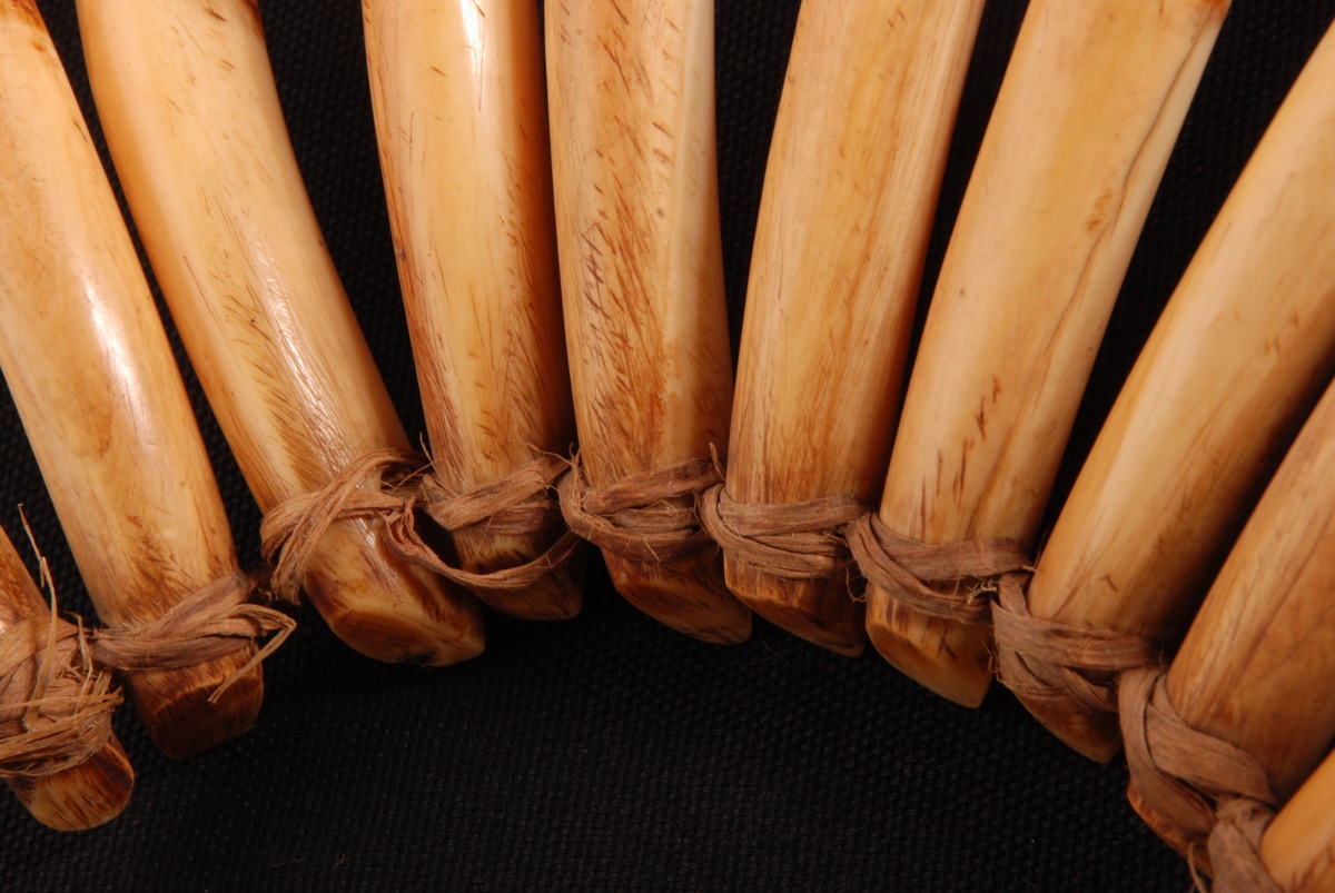 Necklace (waseisei) formed of 25 tusks carved from whale teeth, pierced and the top and strung on a cord of 3-ply plaited hibiscus fibre. An additional length of hibiscus fibre cord is woven around the cord and between the top of the tusks. The neck cord is tied. The tusks all show a vertical reddish mark about 5 cm from the top – maybe the sign that an additional cord was woven around them? The tusks are curving upwards and tapering. The tip of twelve tusks is chipped (from the left, no 3,7, 8, 12, 13, 16, 17, 18, 19, 20, 22, 23). The tusks are of a light cream colour at the front and a rich honey colour at the back. The back of the tusks are severely scratched. A small plastic label attached to the cord reads [handwritten in black ink:] ‘Fiji’ on one side and ’66.6’ on the other side. '1966.6' inscribed in black ink on the side of the first tusk from the right.