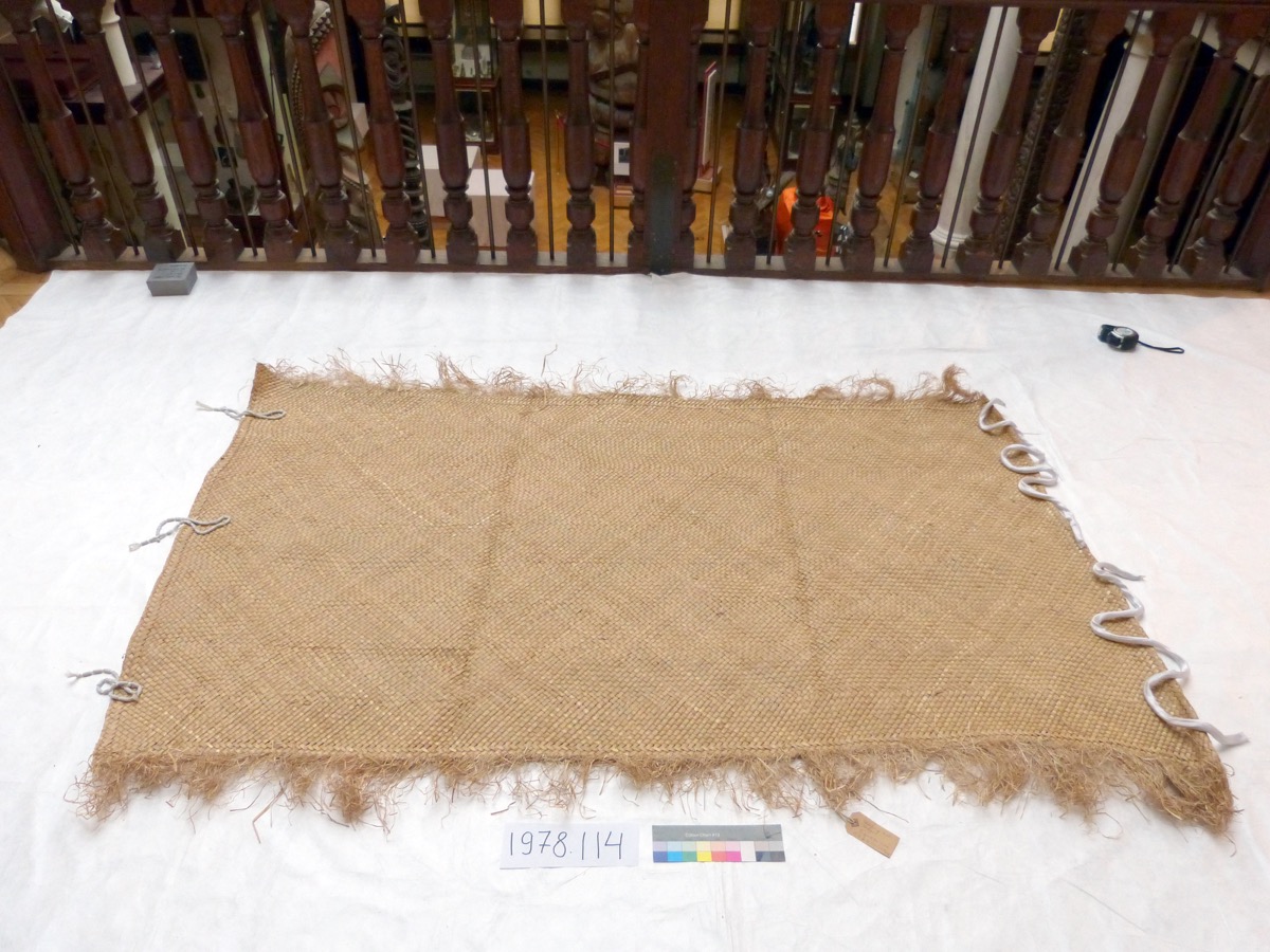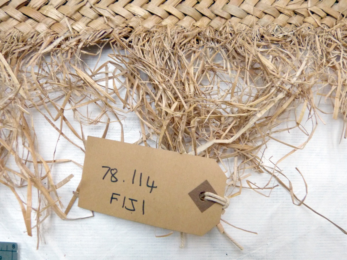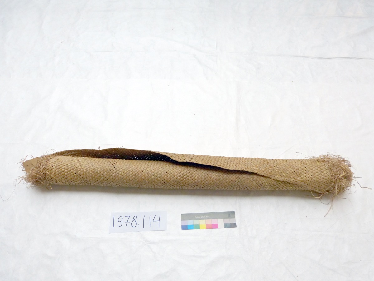 Labels & inscriptions: A modern rectangular cream label attached to the edge of the mat reads [handwritten in black ink:] '78.114 FIJI' on one side. 'Sleeping mat (sedge) Sigatoka area. D. Miss G. Calvert. 1978.'