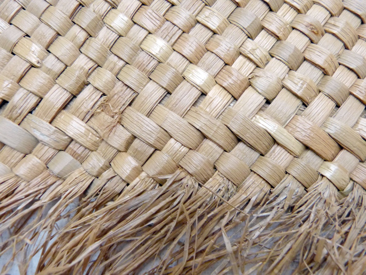 Large ?sleeping mat woven from soft sedge (Kuta), Elaeocharis plantaginea, Cyperaceae. Strips about 0.7 cm wide. Along the long sides, the mat is provided with a long fringe made from the splitting of the kuta fibre into thinner strips. Along the short sides, the fibres are folded back into the matting.