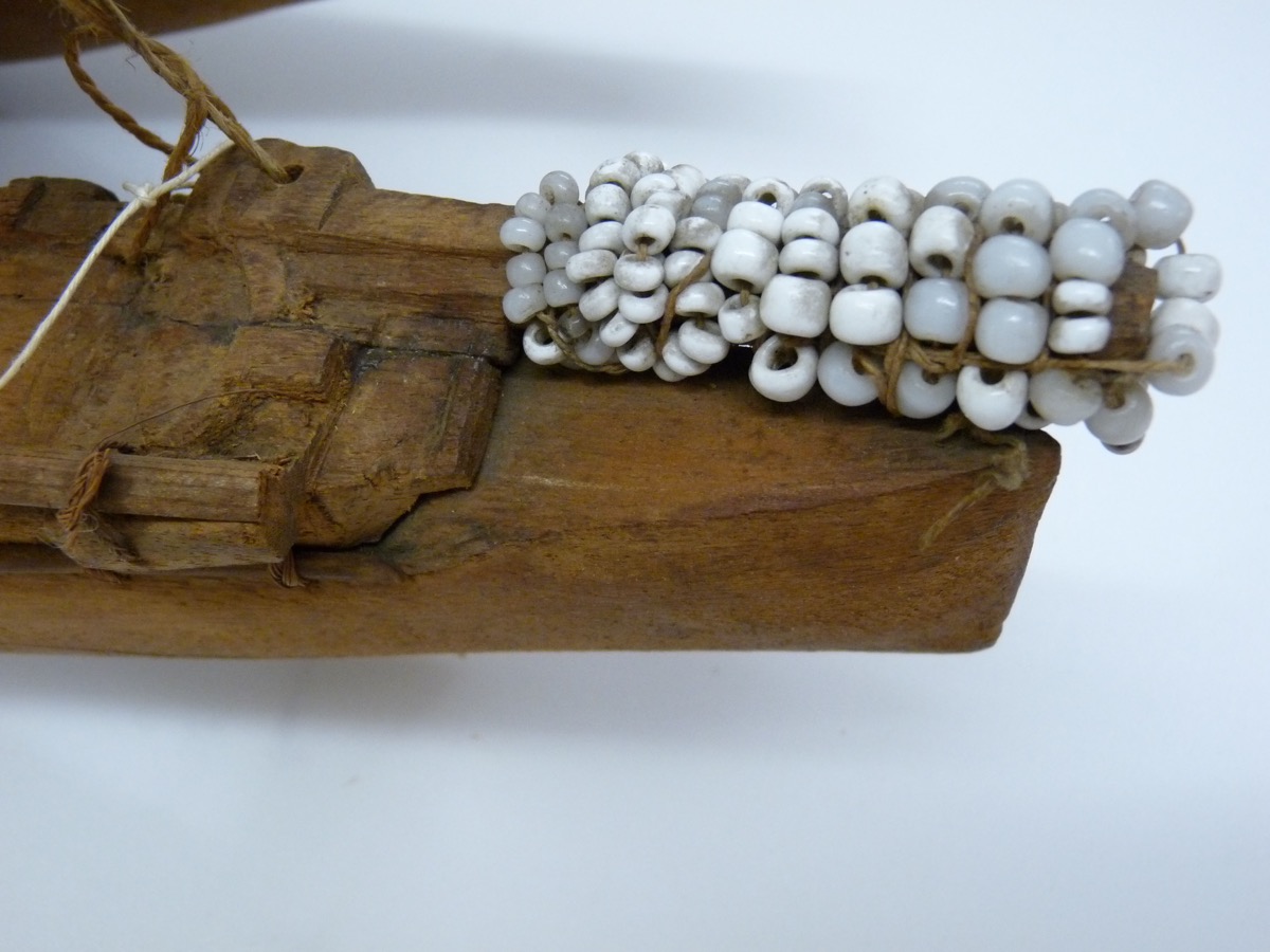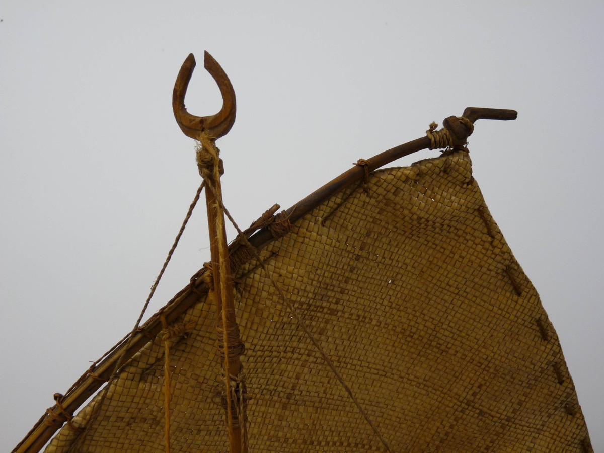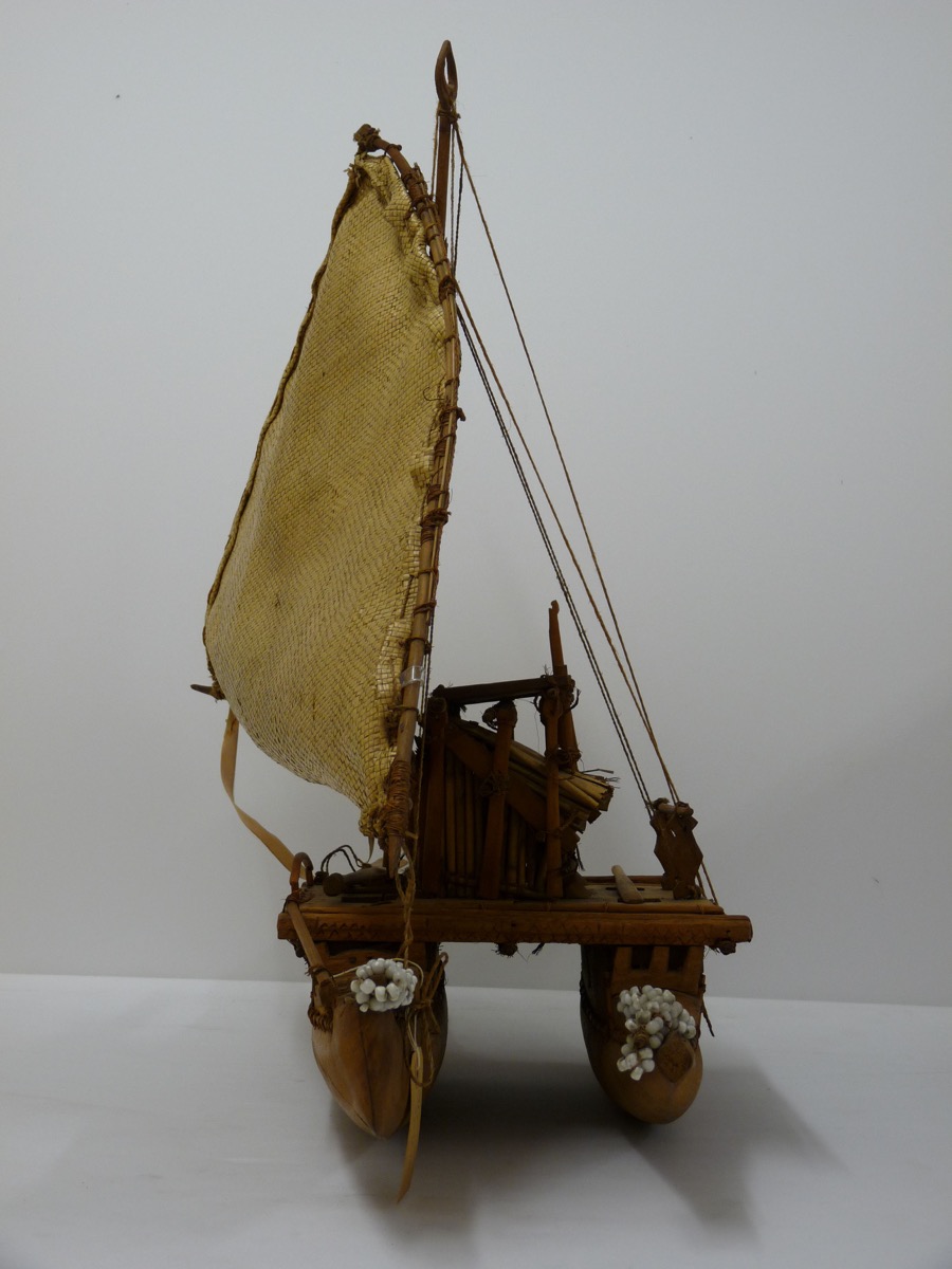 Collected by: Gardiner.Professor.Stanley; Research: Examination of artefact By Roth.G.K On - According to information given in detail in " Canoes of Oceania" , (Vol.1 by James Hornell, pp.304 ff.) This is a carefully made, accurate model of a Fijian double canoe, Ndrua. The proportions of the longer hull, the yard and the mast are good; and other features of a double canoe are all represented. But the platform is too short in length compared with its breadth; the top section of the shaft is too long compared with its mast; and the sail should be in sections fastened together, not ina single piece. There should also be more than one steering paddle, sculling oar, and baler