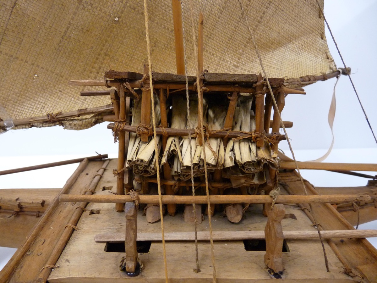 Model of a sailing double canoe with deckhouse.