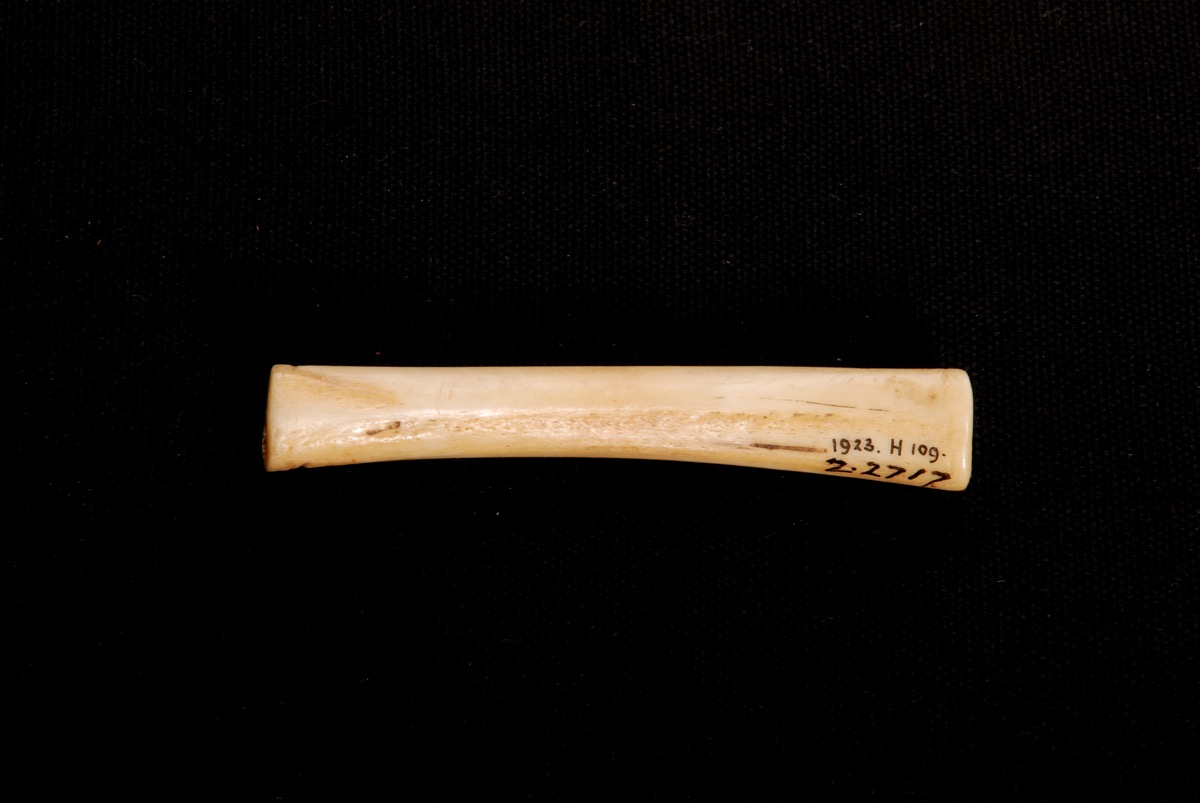Small section of ?bird bone with polished surface. '1923.H109.' and 'Z-2717' inscribed in black ink on the object.