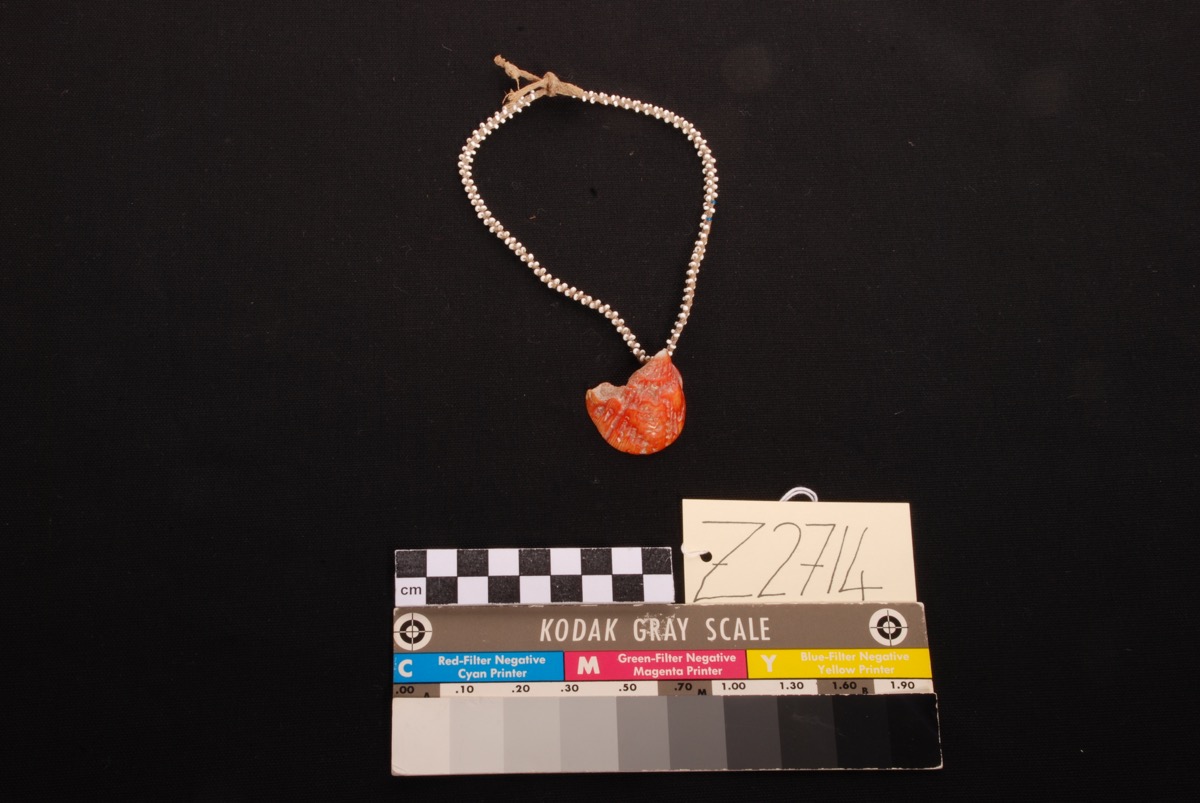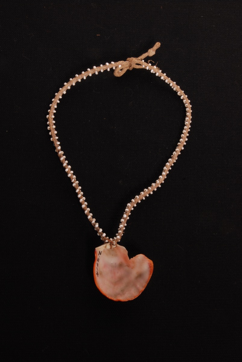 Necklace formed of a ?spondylus shell, the umbo perforated to accommodate a ?four ply cord of vegetable fibre. On three sides of the plait small white glass beads and two blue glass beads are woven into the plait. The other side (in contact with the neck) is not decorated with beads. One end of the neck cord terminates in a knot. Both ends are knotted together. No label. ‘Z 2714’ inscribed inside the shell in black ink.