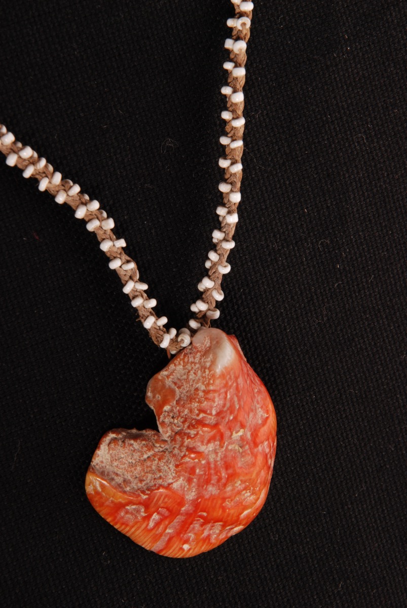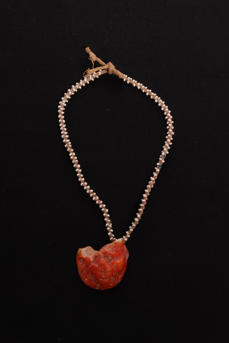 Red, small, with fibre and bead chain. Made of Volute Shell