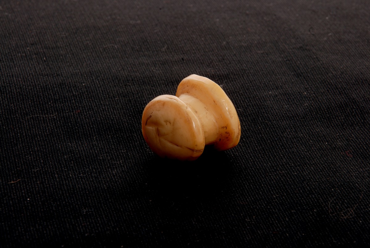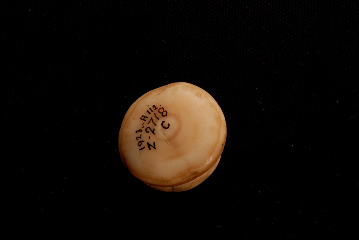 Earplug carved from whale tooth shaped like a cotton reel. Each end is carved into a globular oval shape with a flat polished surface. One end is larger than the other; the smaller end has a shape scratched into the surface that looks like an inverted V with a line drawn horizontally across the top with the number ‘2’ scratched next to it. The smaller end also has some cracking around the edge. '1923.H112.' and 'Z-2718 C' inscribed on the object in black ink.