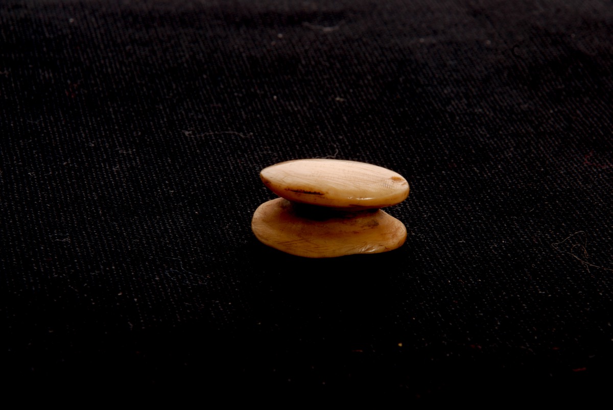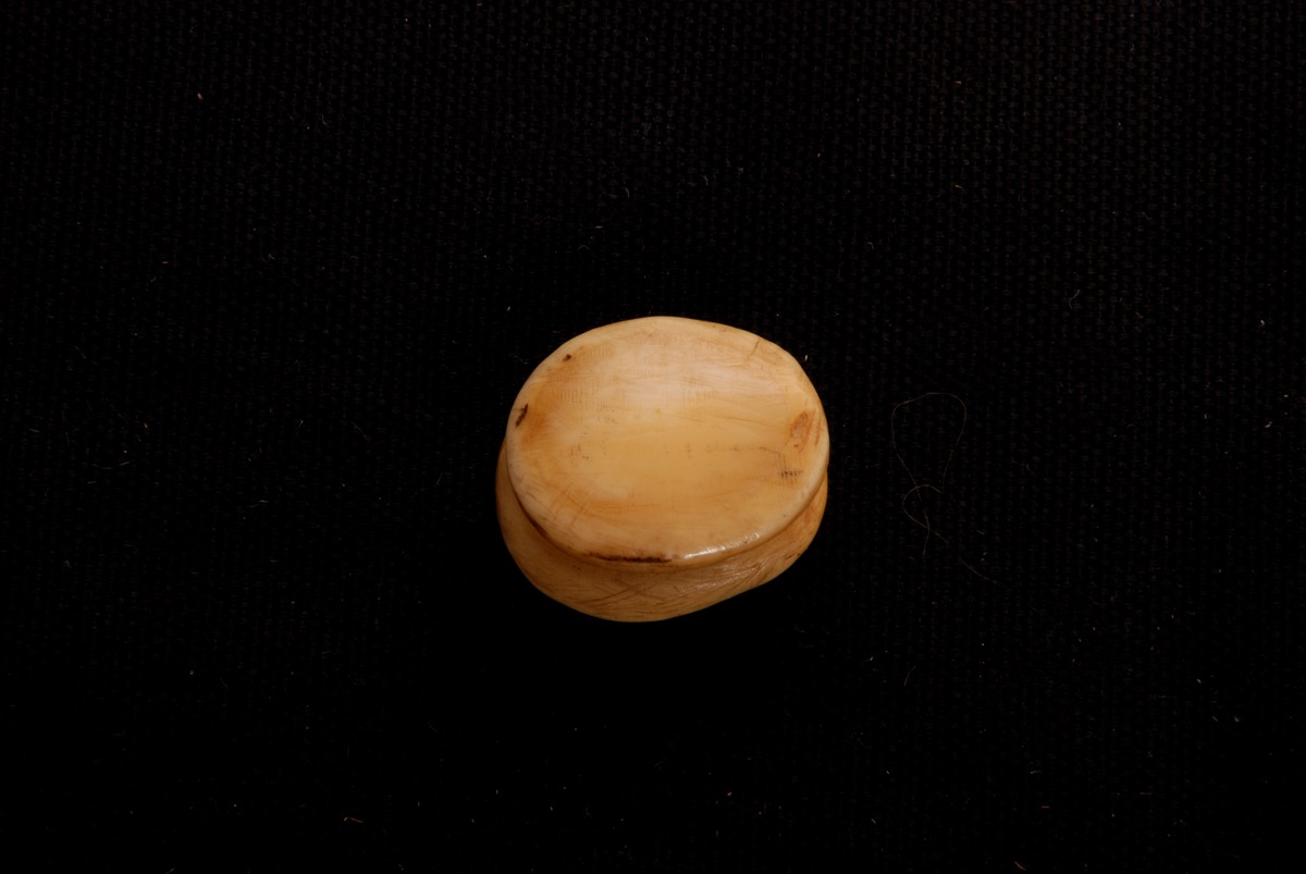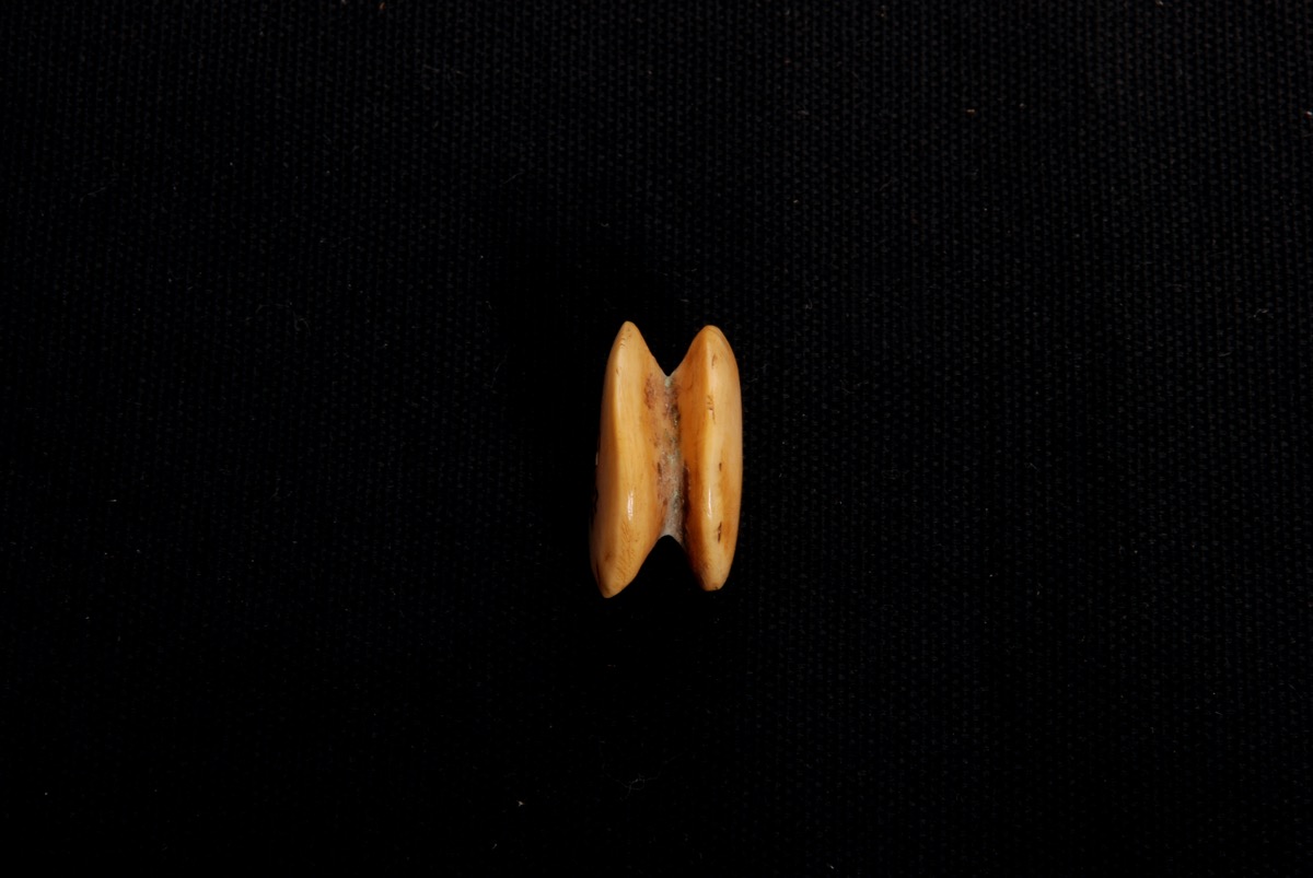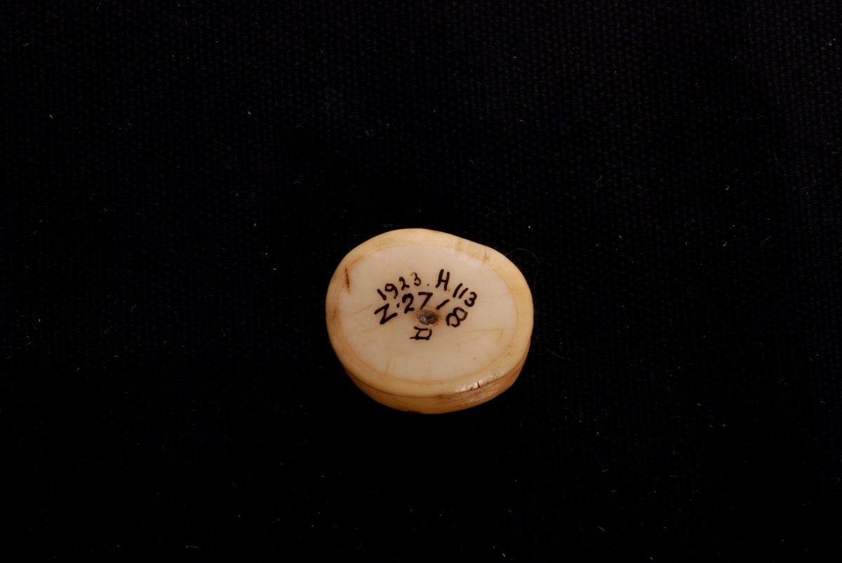 Oval shaped earplug made from whale tooth with a very deep groove through the centre (shaped like a yoyo). Some green discolouration inside the groove. One side of the oval has a small hole bored into the centre. '1923.H113.' and 'Z-2718 D' inscribed in black ink on the object.