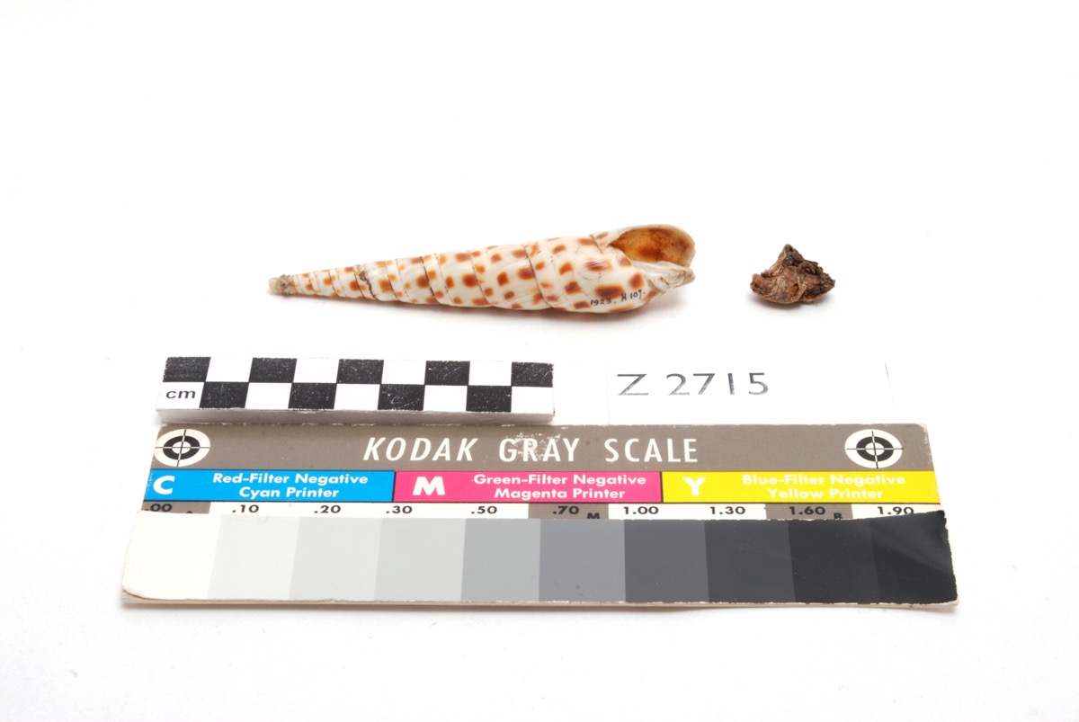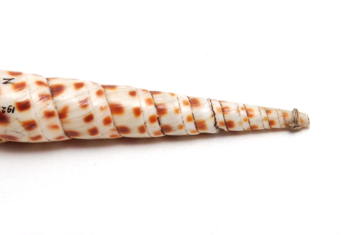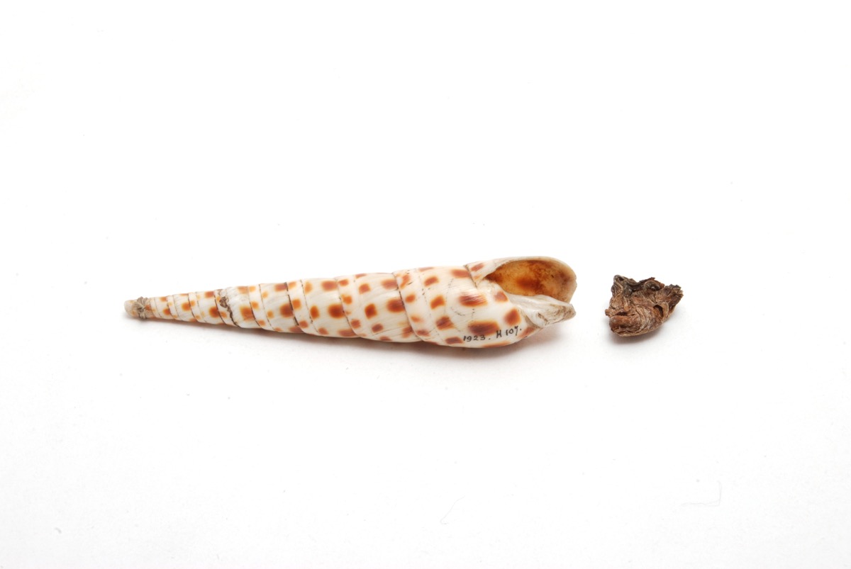 Ear ornament formed of a gastropod shell (possible Terebra Maculata, Terebridae family). A bundle of vegetable fibre used to be inserted in the cavity of the shell (visible on the picture stapled to the catalogue card) but the vegetable fibre was found detached from the object in December 2011 and is now kept with the object in a separate bag. The apex is chipped and a very thin piece of string is coiled around it. 'Z. 2715' and '1923.H107' inscribed in black ink near the mouth of the shell.