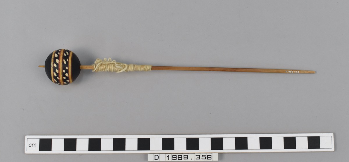 Whirl or long stick with circular (ball shaped) weight decorated with yellow and red stripes and white dashes. Basic colour black. Has cotton wound round stick; Good; Whole