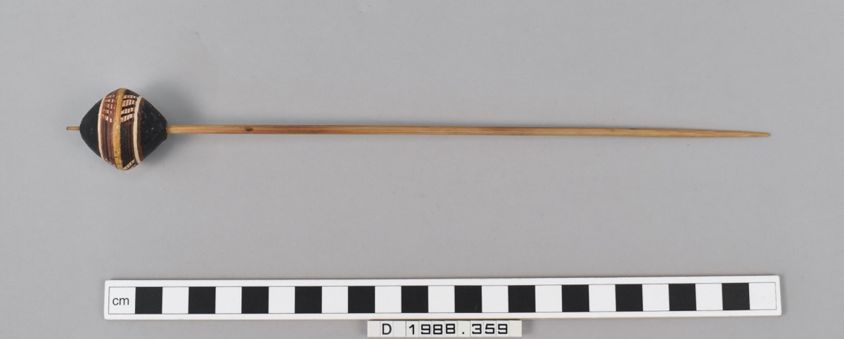 A whirl. Consisting of a thin stick, cylindrical in shape with each end tapering to a point, fitted just above one end is a clay biconical weight. The clay ball is decorated with a red, yellow and white striped pattern at the centre on a black background. Used in textile production to spin wool or cotton.