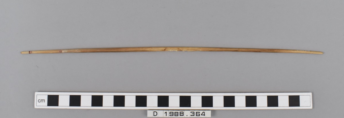 A thin stick, cylindrical in shape with each end tapering to a point. Possibly part of a whirl for use in textile production.