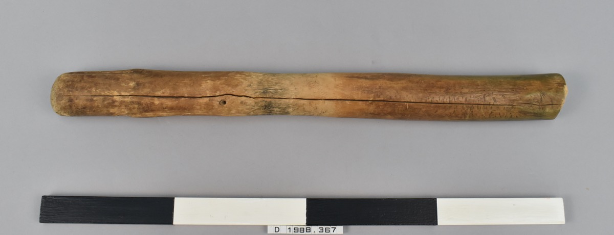 A piece of wood, cylindrical in shape with one rounded end and one roughly cut end. Used in textile production as part of a weaving apparatus; signs of wear on the objects' surface.