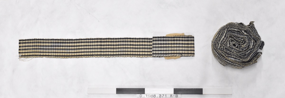 Long piece of woven cotton wound up [A]. Blue and white check pattern. Possibly many lengths of cloth wound together; with one length separate from bundle [B].