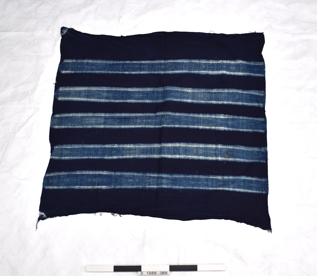 Square of dark blue cotton with tie-dye stripes in white. One side given the effect of even light blue and dark blue stripes, the other dark blue with narrow white stripes and dashes.
