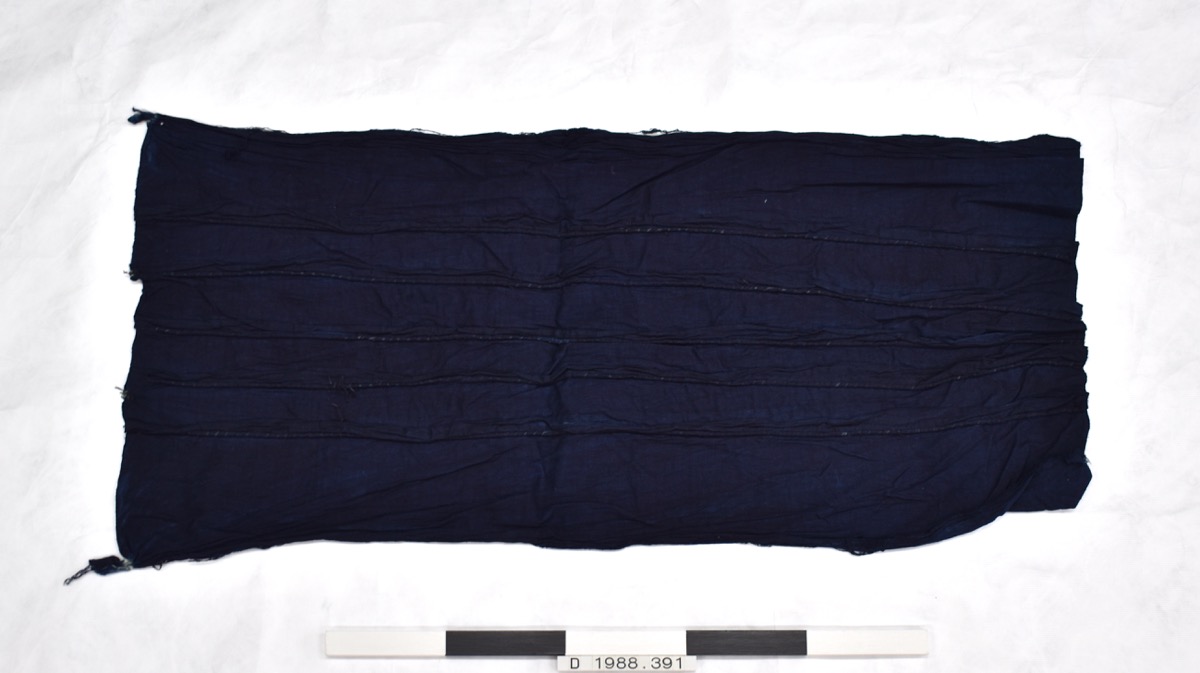 Small rectangular piece of dark blue cotton. Five pieces of cord are sewn into the fabric, lengthwise giving the fabric a raised stripe on one side. Presumably the cords would be pulled out and the fabric would have a white stripe.