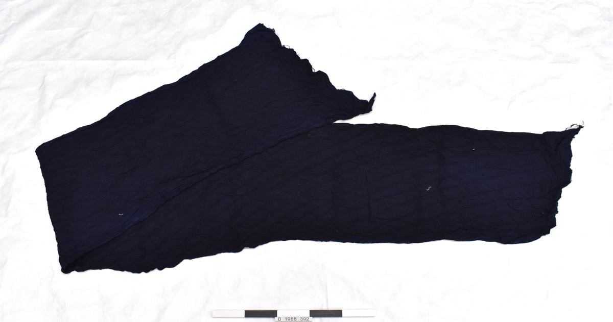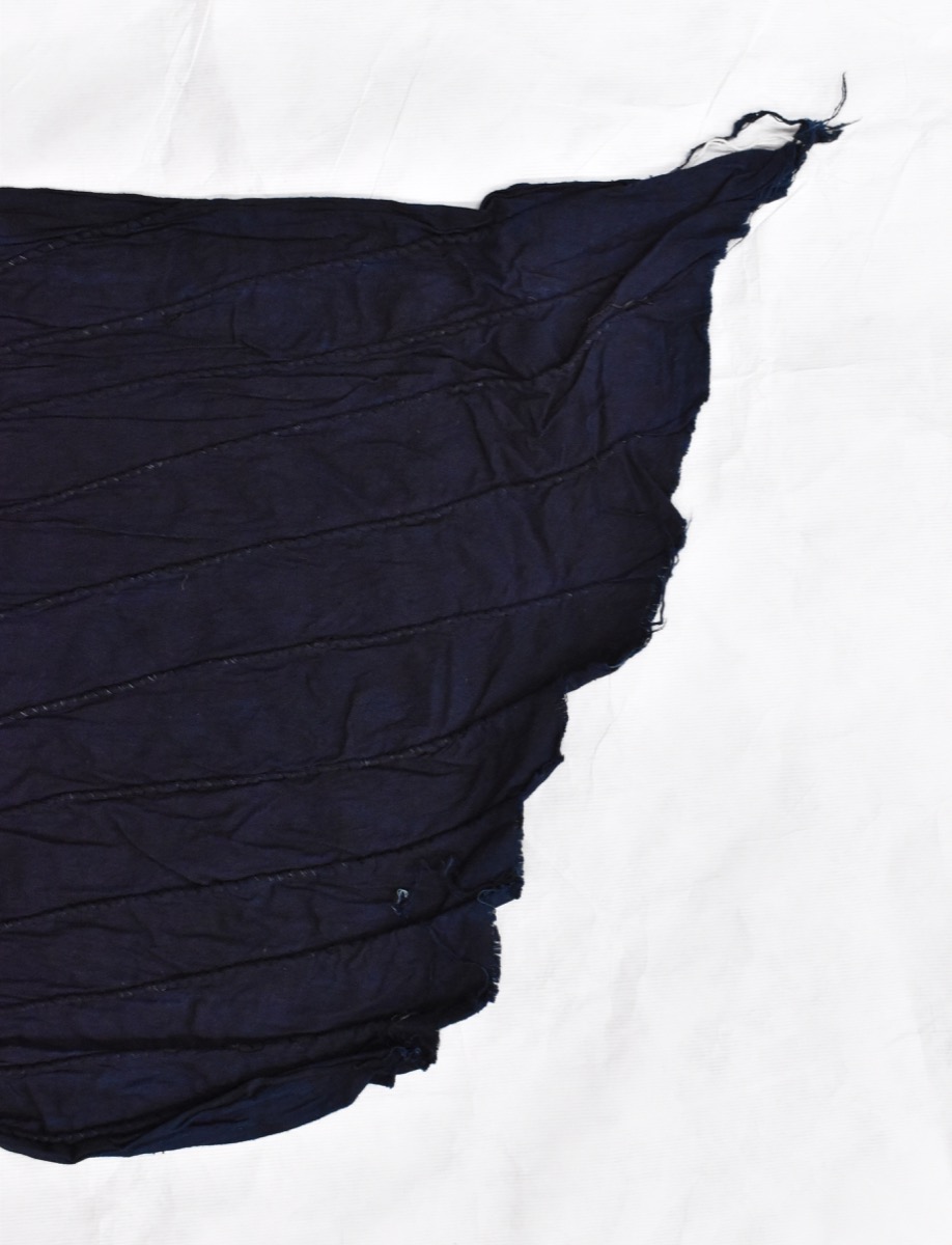 Long piece of dark blue cotton with cord sewn in diagonally. Presumably this will give the fabric a white stripe if taken out.