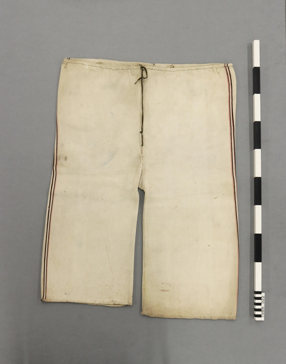 Catalogue card for 1988.322 notes: 'White woven cotton [trousers] with drawstring waist and decorated with double black and red (pink) lines on either outside leg. Holes torn out near waist for possible belt? Fabric stained with age.'