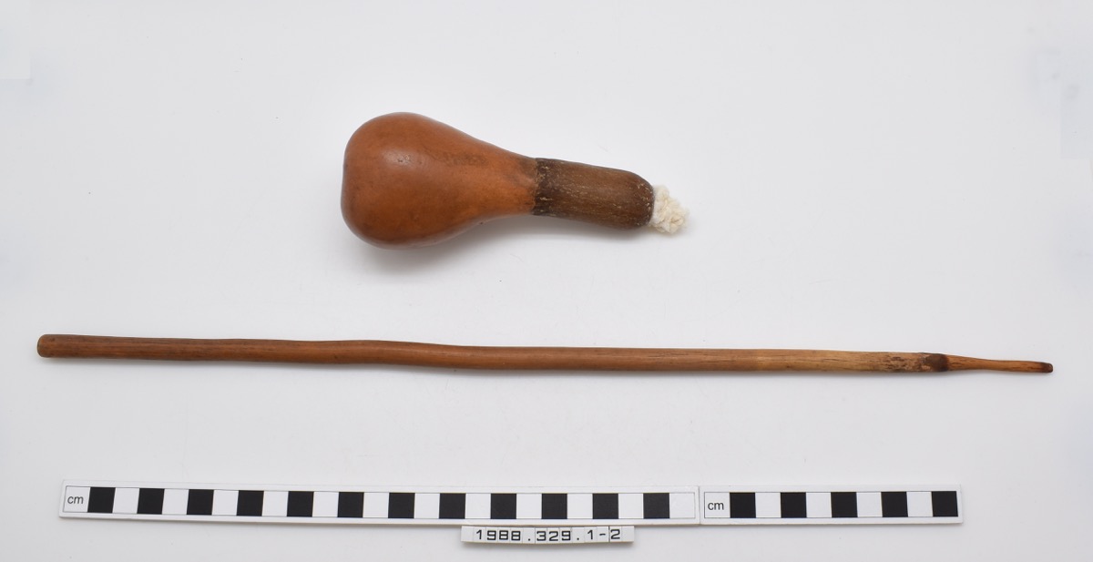 Poporo. Lime container [.1] made from a calabash with a wooden stick [.2]. Container has been plugged with cotton.