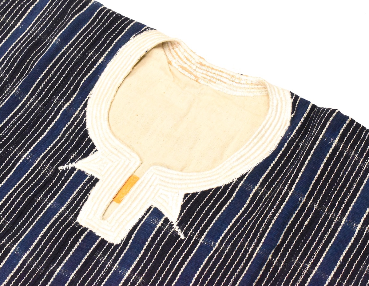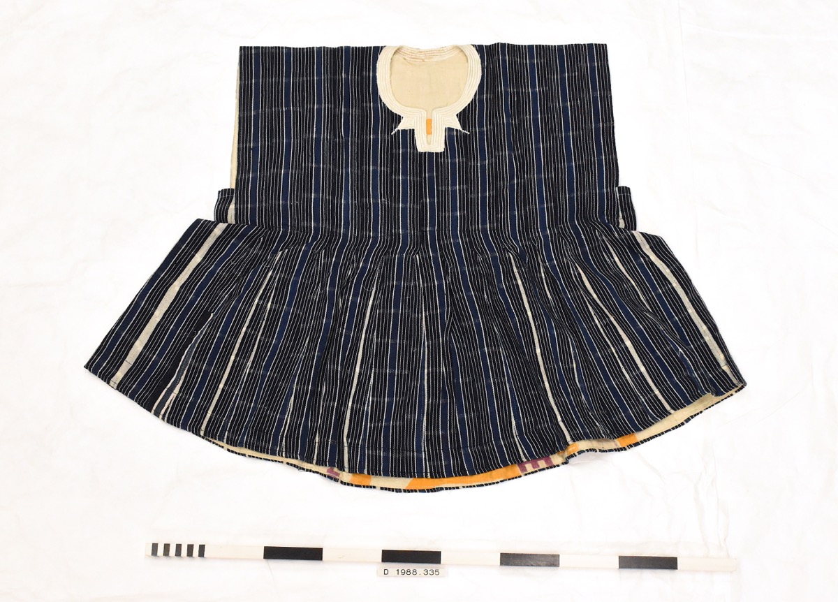 Tunic of woven cotton with dark blue, light blue and white stripes, machine stitched and lined with cream cotton. It has a round neckline with a small slit at the bottom, decorated with a thick band of white satin finish cotton thread. The upper part of the tunic is straight from shoulder to hem with open armholes to the waist. The lower part flares out with pleats from the waist.