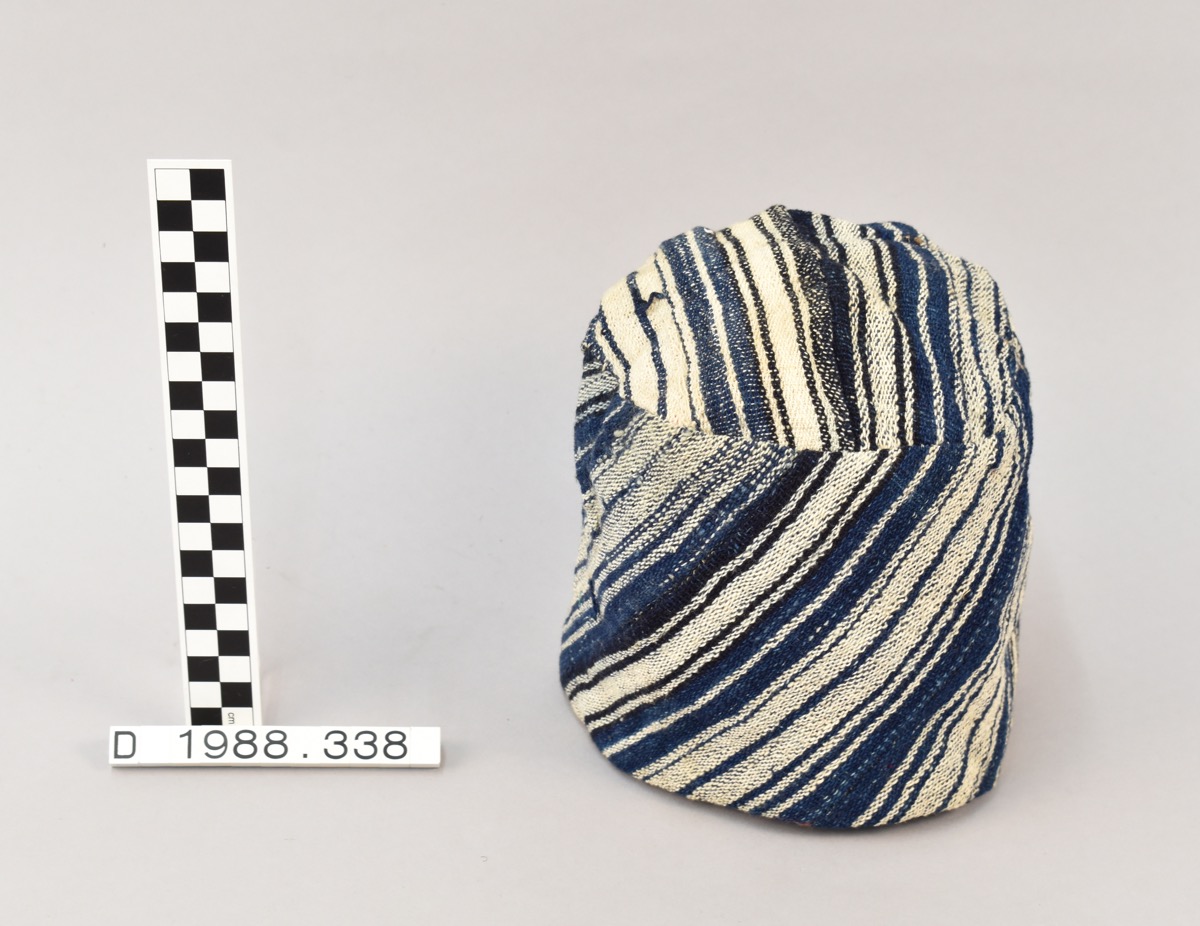 Small blue and white stripe hat made from woven cotton. Lined with beige and pink silk fabric. Hand sewn; Good; Whole