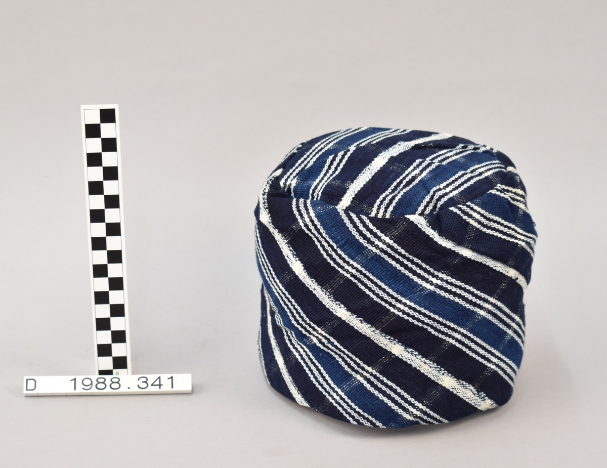 Hat - Woven cotton, dark blue, light blue and white stripe. ' Lighter' white stripe woven in diagonally to give the effect of a checked fabric. Lined in cream cotton. Hand stitched; Good; Whole