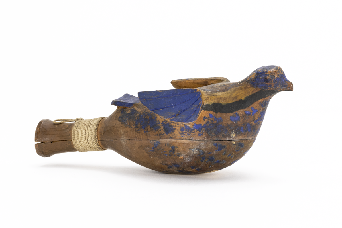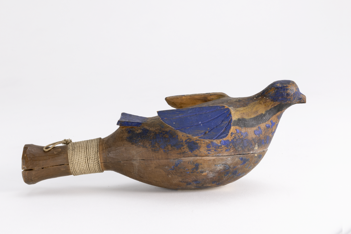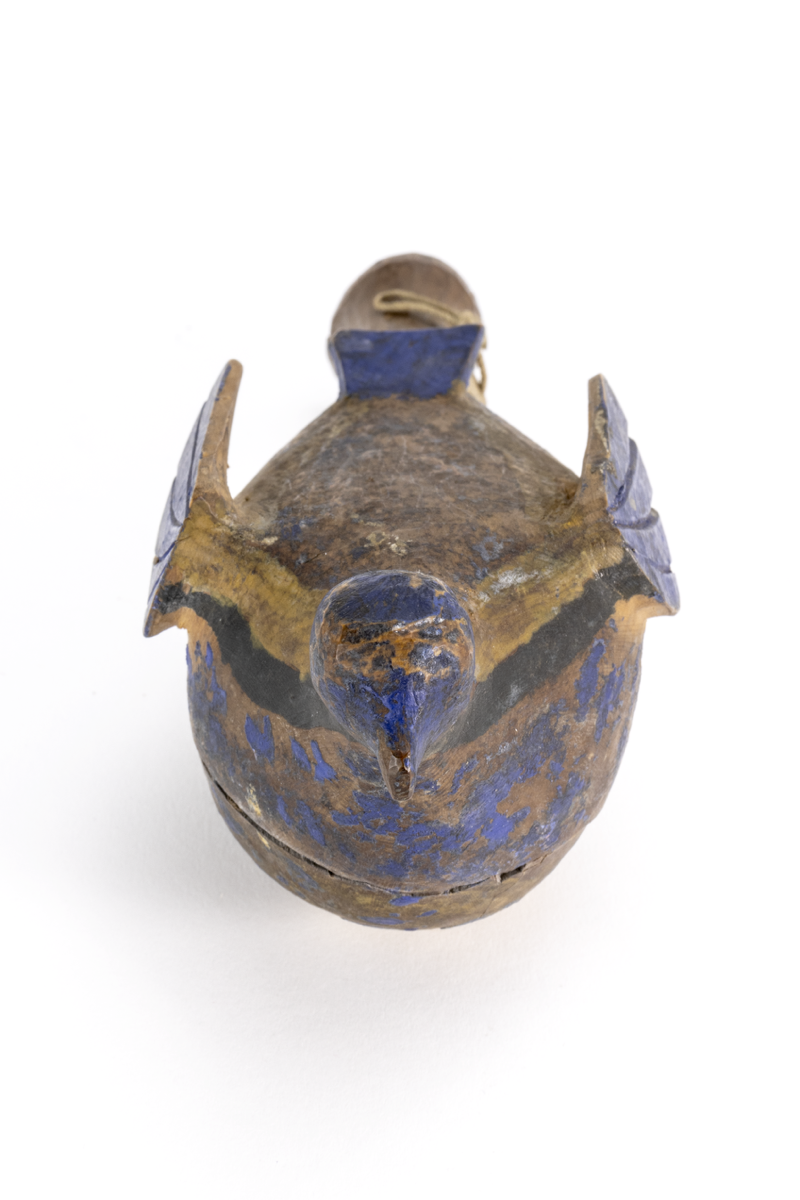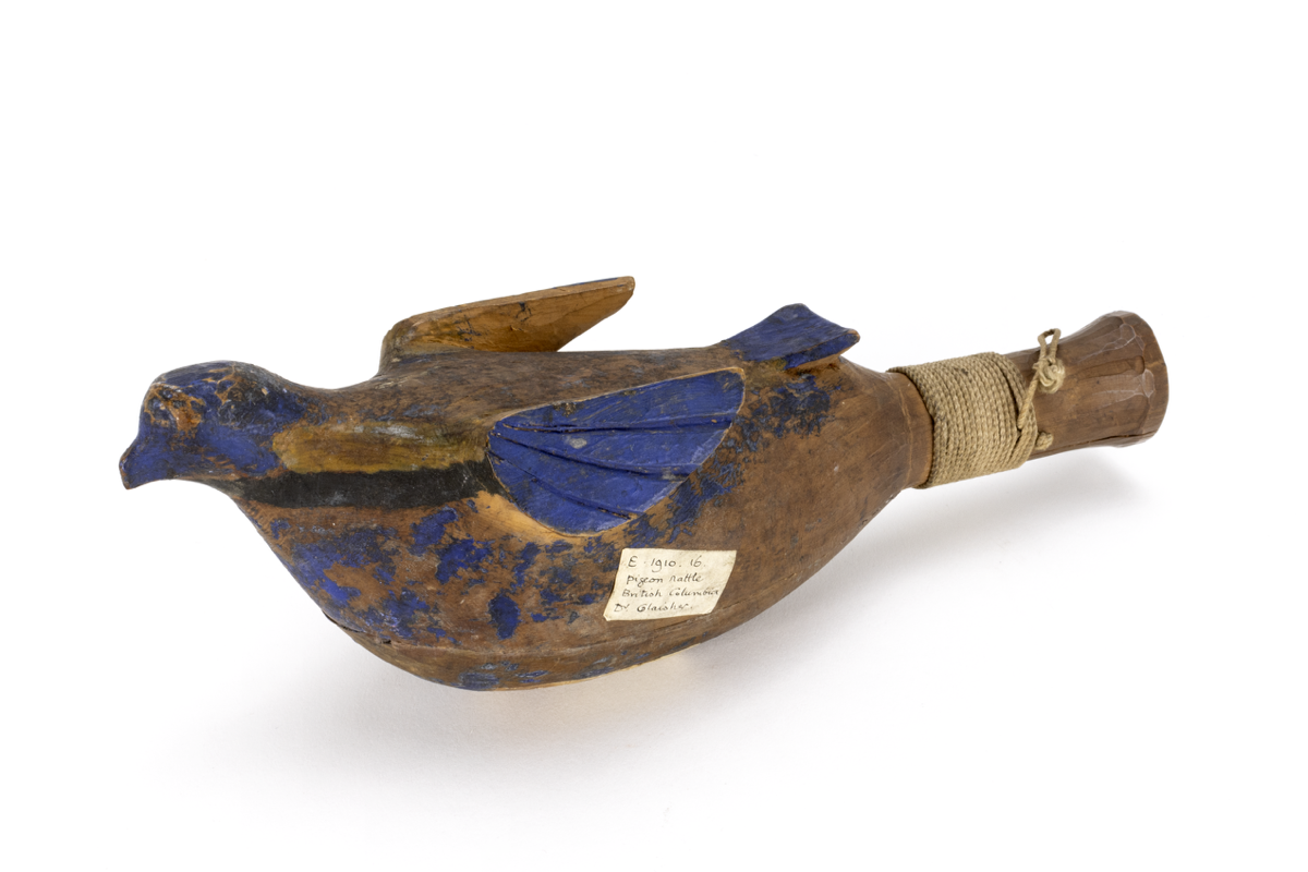 A wooden rattle carved in the form of a ?pigeon with a small head, wings and tail. The handle of the rattle is bound with string to keep the two sections together. Inside the rattle small objects can be heard. The bird has been painted blue and black.