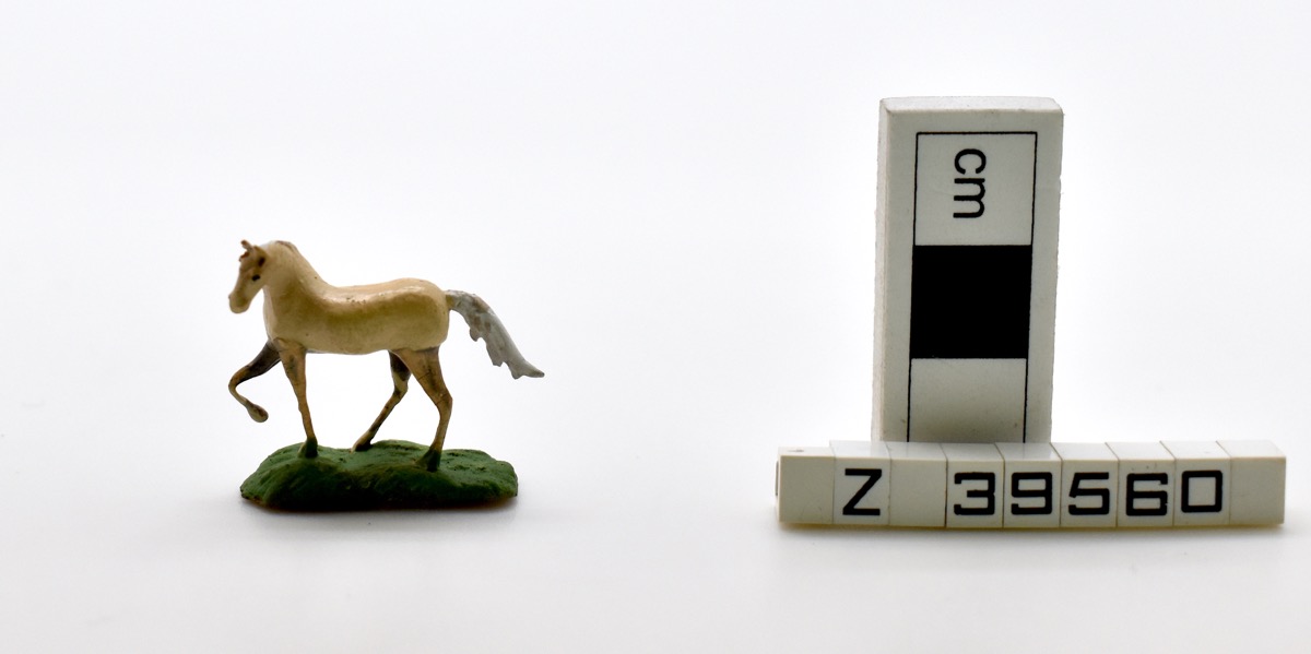A miniature toy model of a horse standing on grass with one leg raised. Made from clay that has been modelled on wire and then painted. Made as a children's toy.