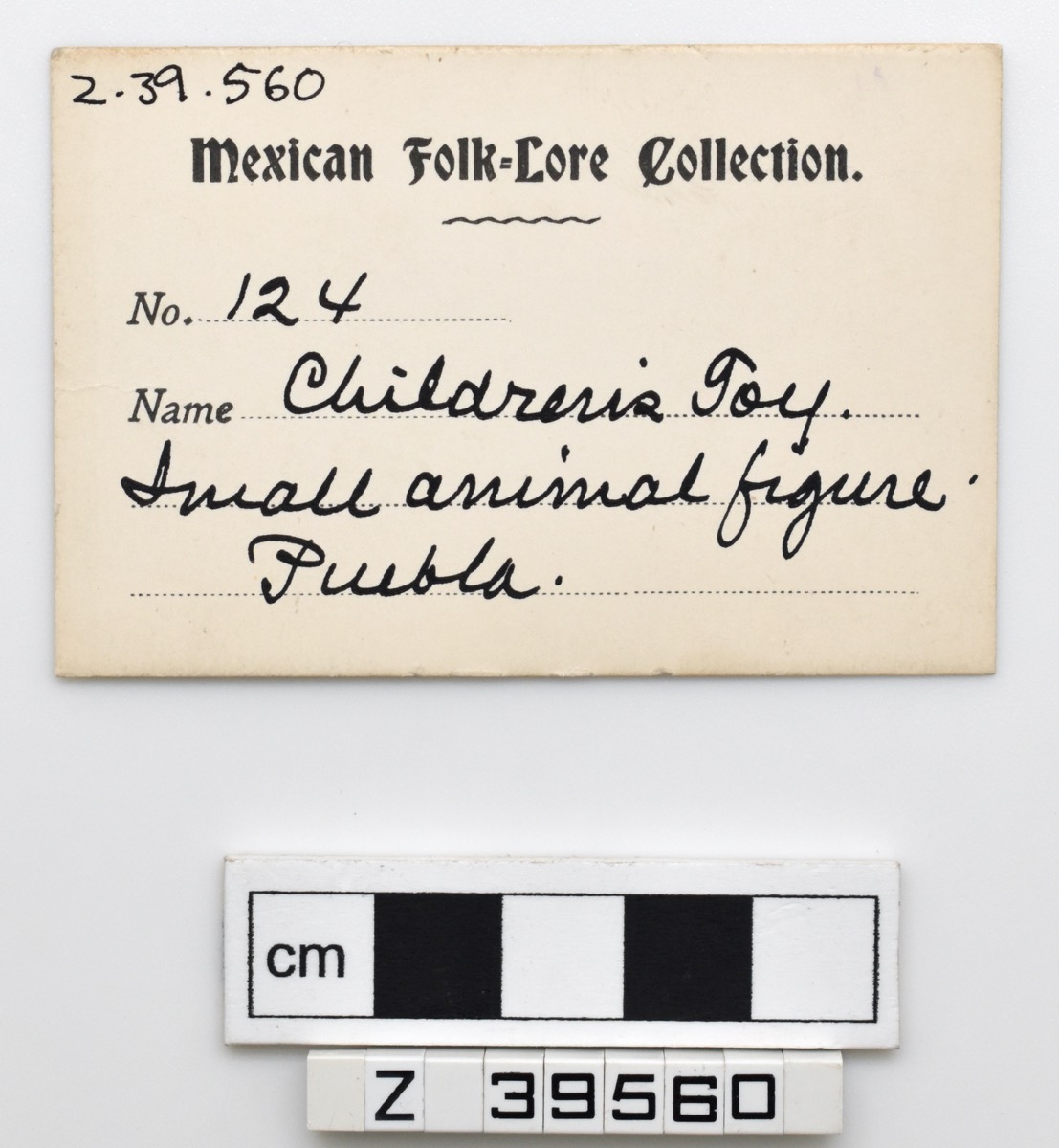 The Frederick Starr Collection of Mexican Folklore was never catalogued when it came to the museum. Cataloguing was done in 1984 when, by error, some of the items were entered in the 1984 book instead of the Z book. To try to correct this in the simplest way possible, all these numbers were grouped under a single Z number, in addition to the number already given. The remainder of the collection was then given individual Z numbers in the normal way. The collection was examined in 1984 by Dr Charlene Cerny (Director of the Museum of National Folk Art in Santa Fe, New Mexico) and her colleague, Valentin Jacques, both experts on Mexican folk art. Her notes on the collection, together with a xerox of the original catalogue, which has full details on the uses of the various items, is on file. The collection is unusual in being well documented and of such an early date, and is a rare one outside Mexico. Not all the items listed in the original catalogue were found at the time of cataloguing.