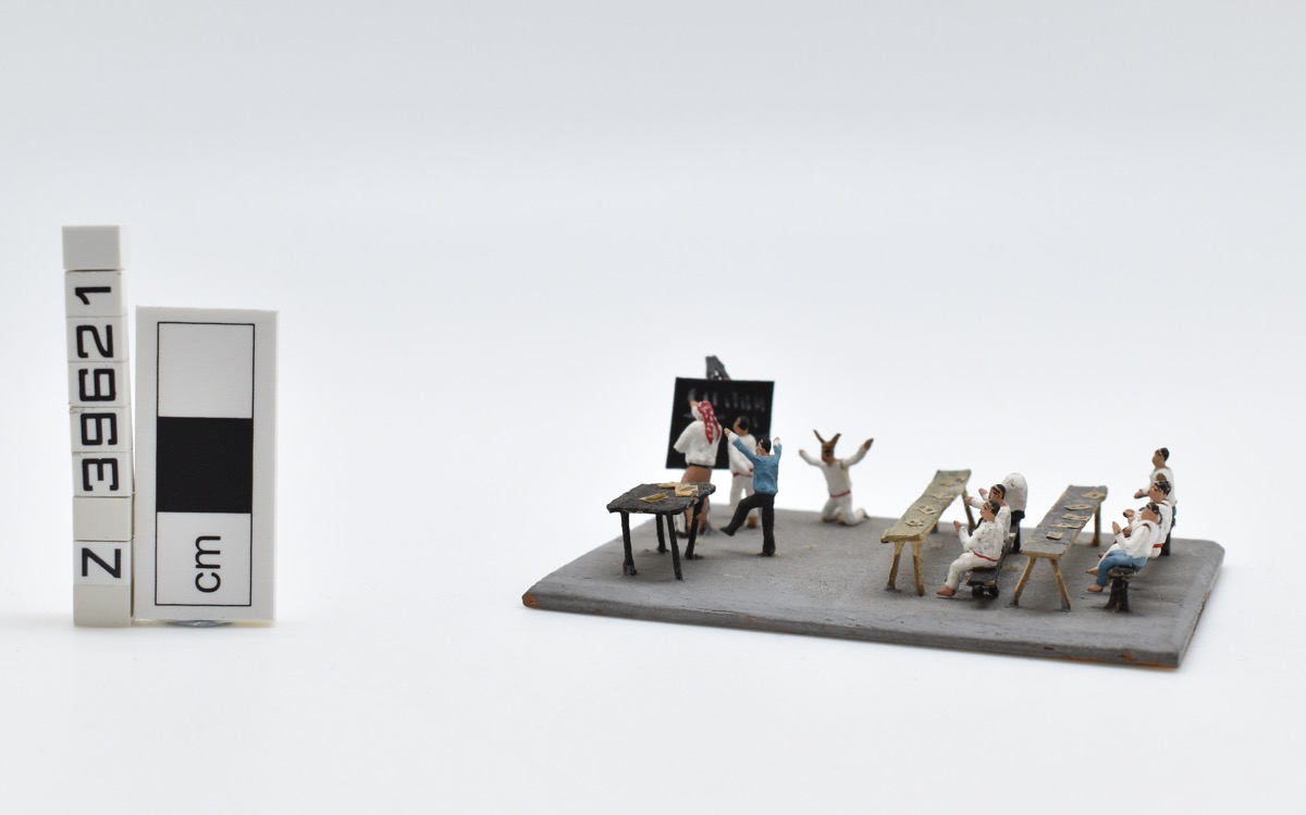 Miniature scene of a school with pottery figures. Figures wearing white sat along two wooden benches; one kneeling figure wearing a hat; one figure wearing blue standing next to a black table with papers; two figures standing at a black board. All fixed to a grey wooden base. Two figures detached from benches but present.
