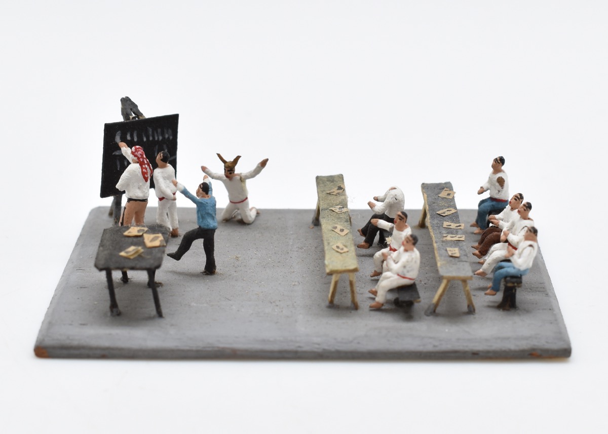 Pottery miniature of a scene in school.