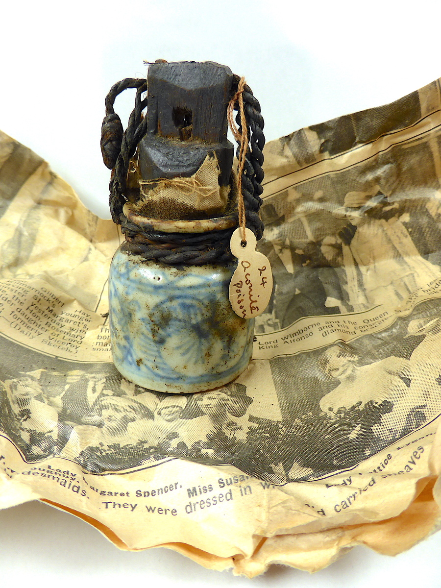 Rectangular paper label pasted to newspaper wrapping notes in pencil' Poison for arrows'