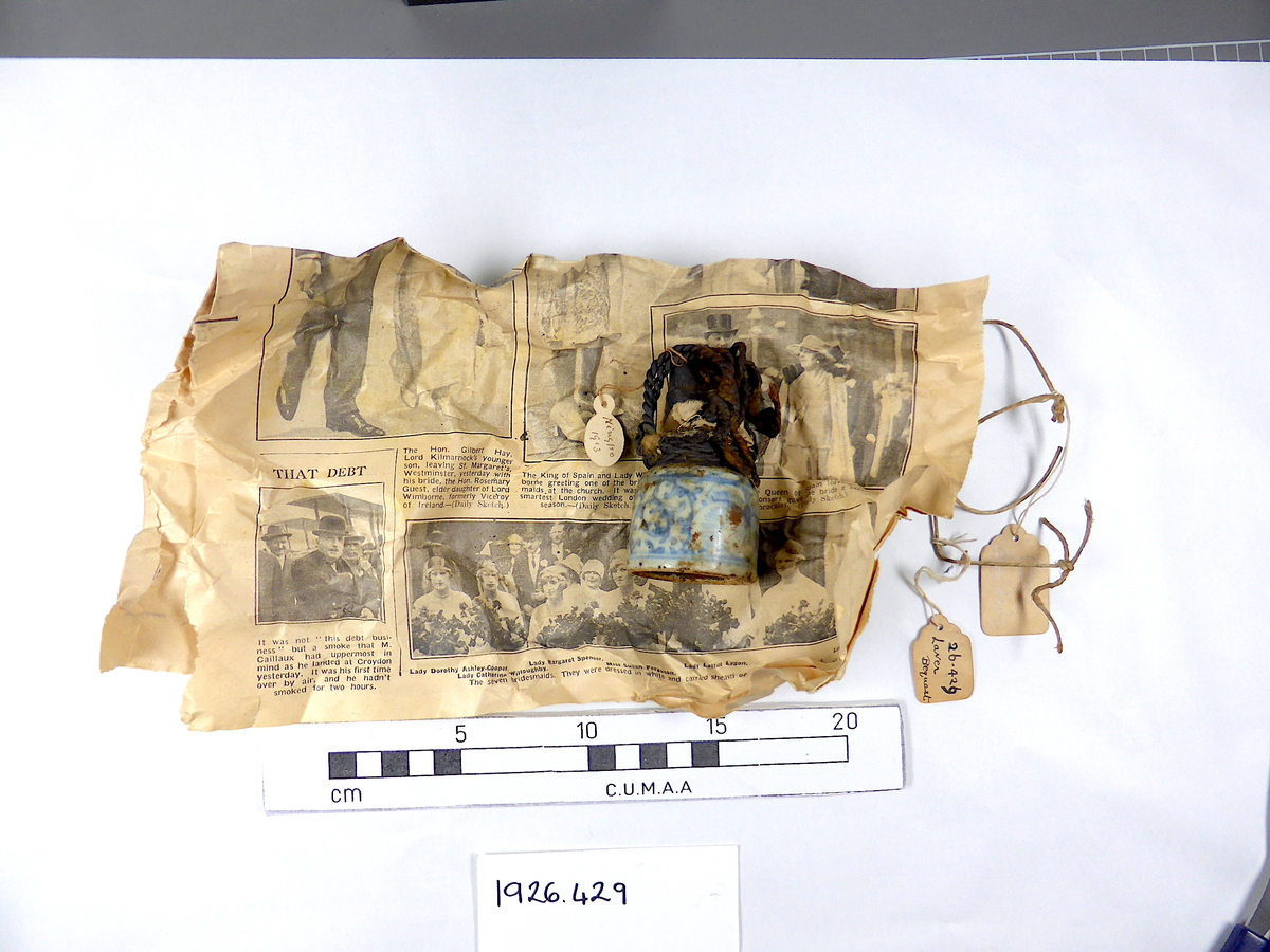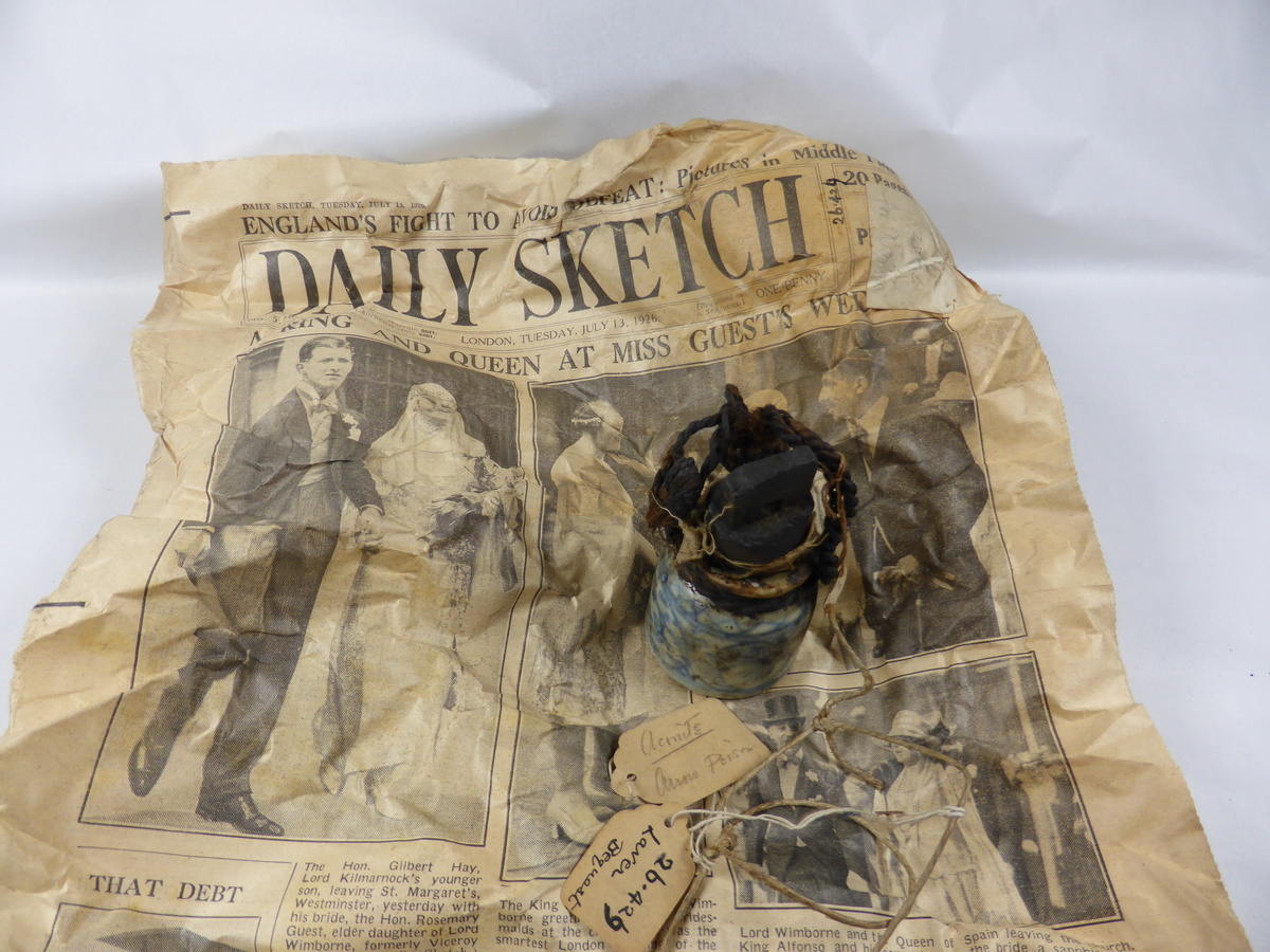 Previously protectively wrapped in newspaper the Daily Sketch from 13 July 1926, with the headline 'A King and Queen at Miss Guest's wedding'.