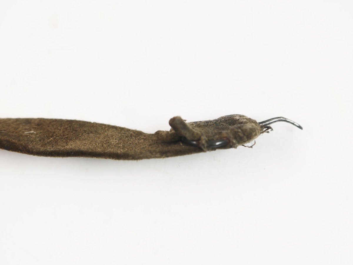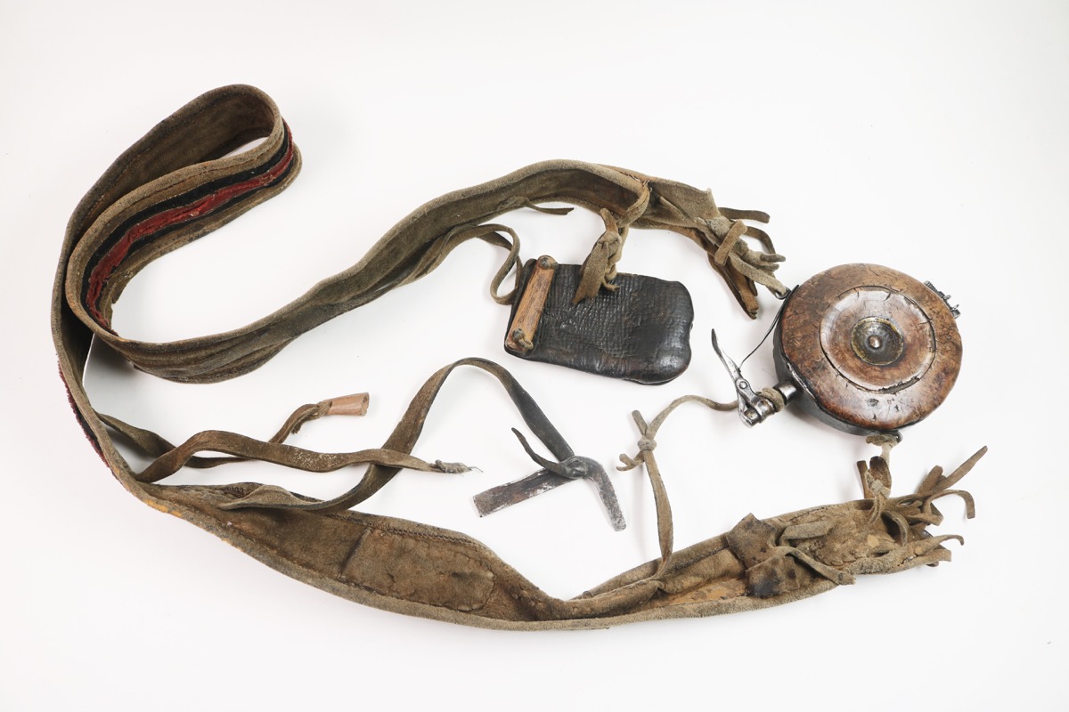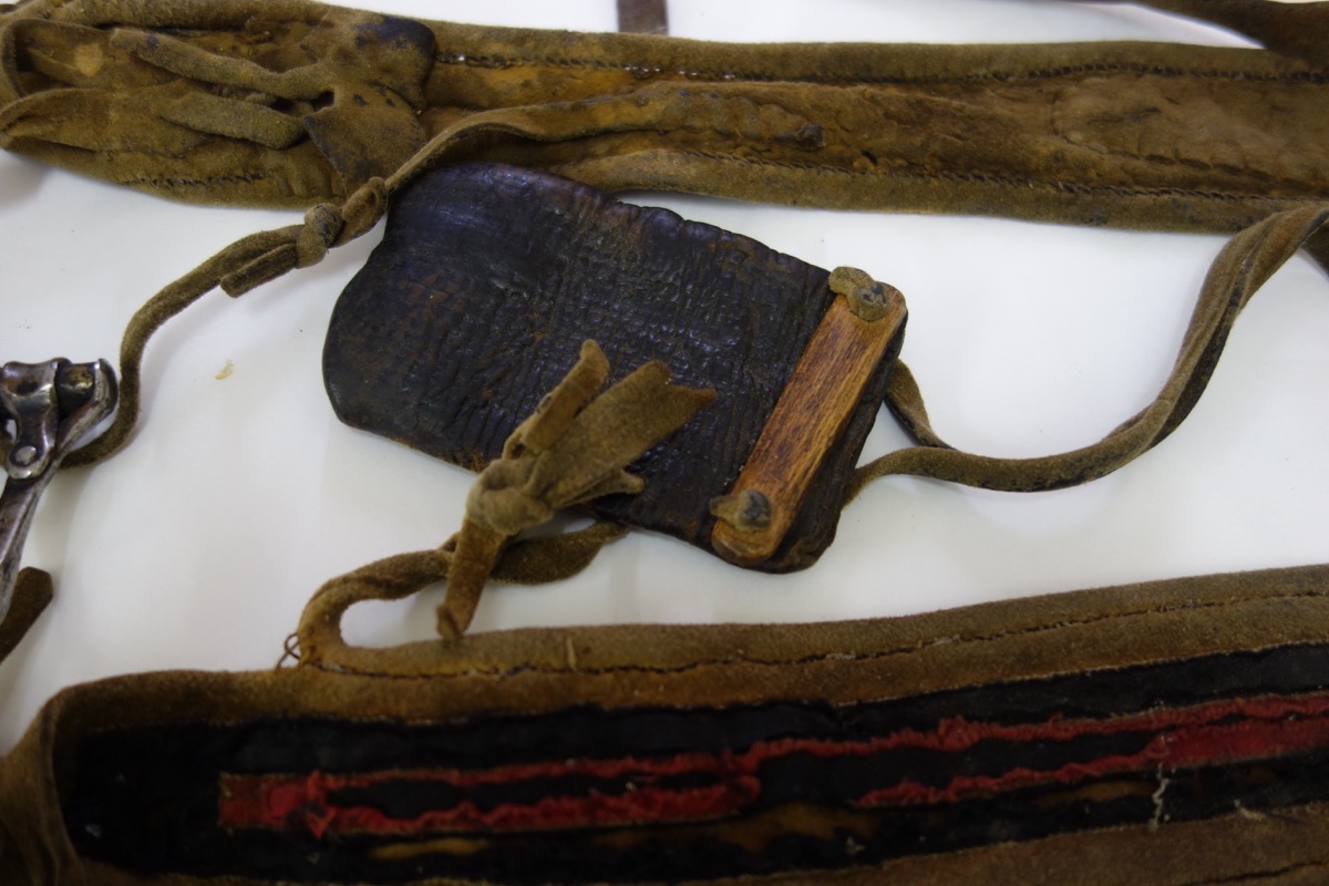Bandolier of chamois and cloth with case for birch root powder case, leather case for bullets and iron tool. A small, cup-shaped object made of wood is for measuring out the correct amount of powder for each cartridge.
