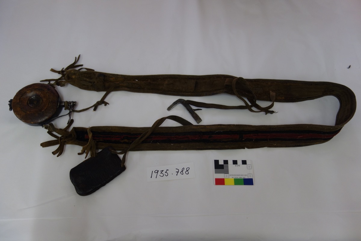 Catalogue card for 1935.788: 'Bandolier, alla, with case for powder, naturushka, and case for bullets, puleruk. Powder case is made of birch root. A small cup-shaped object made of bone is for measuring out the correct amount of poweder for each cartridge. Iron instrument has various uses.'