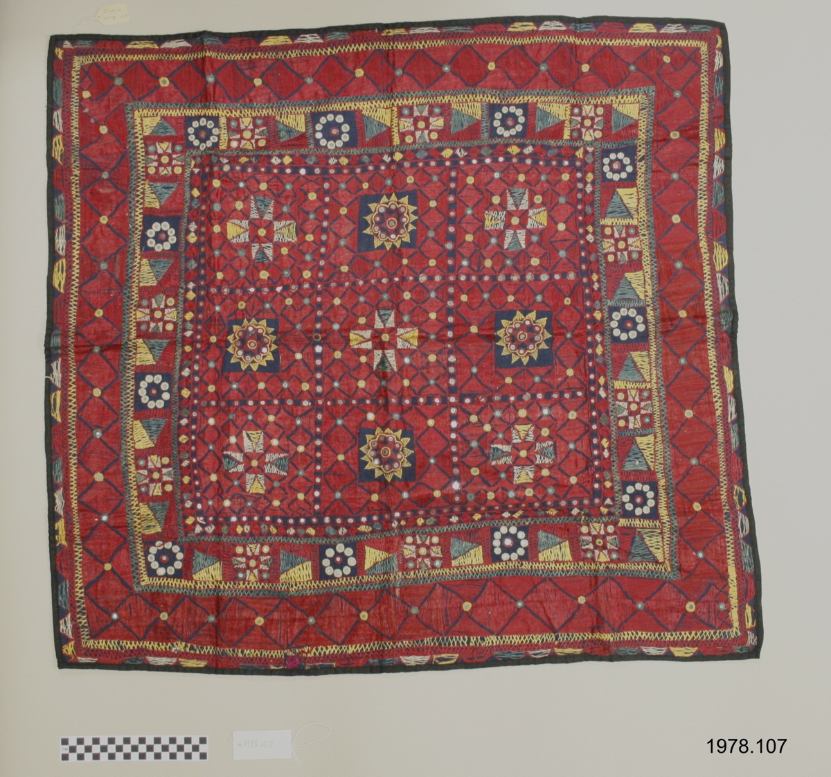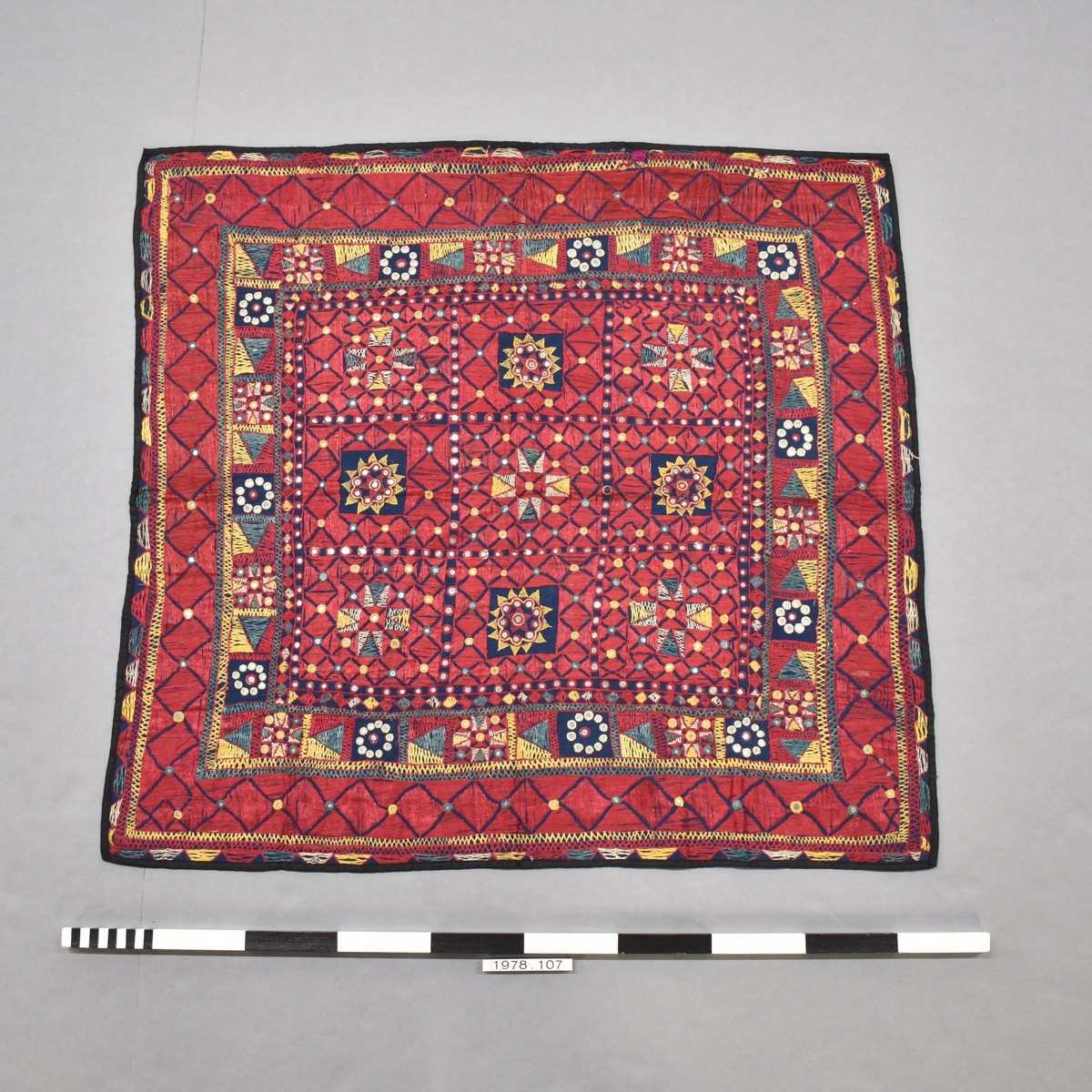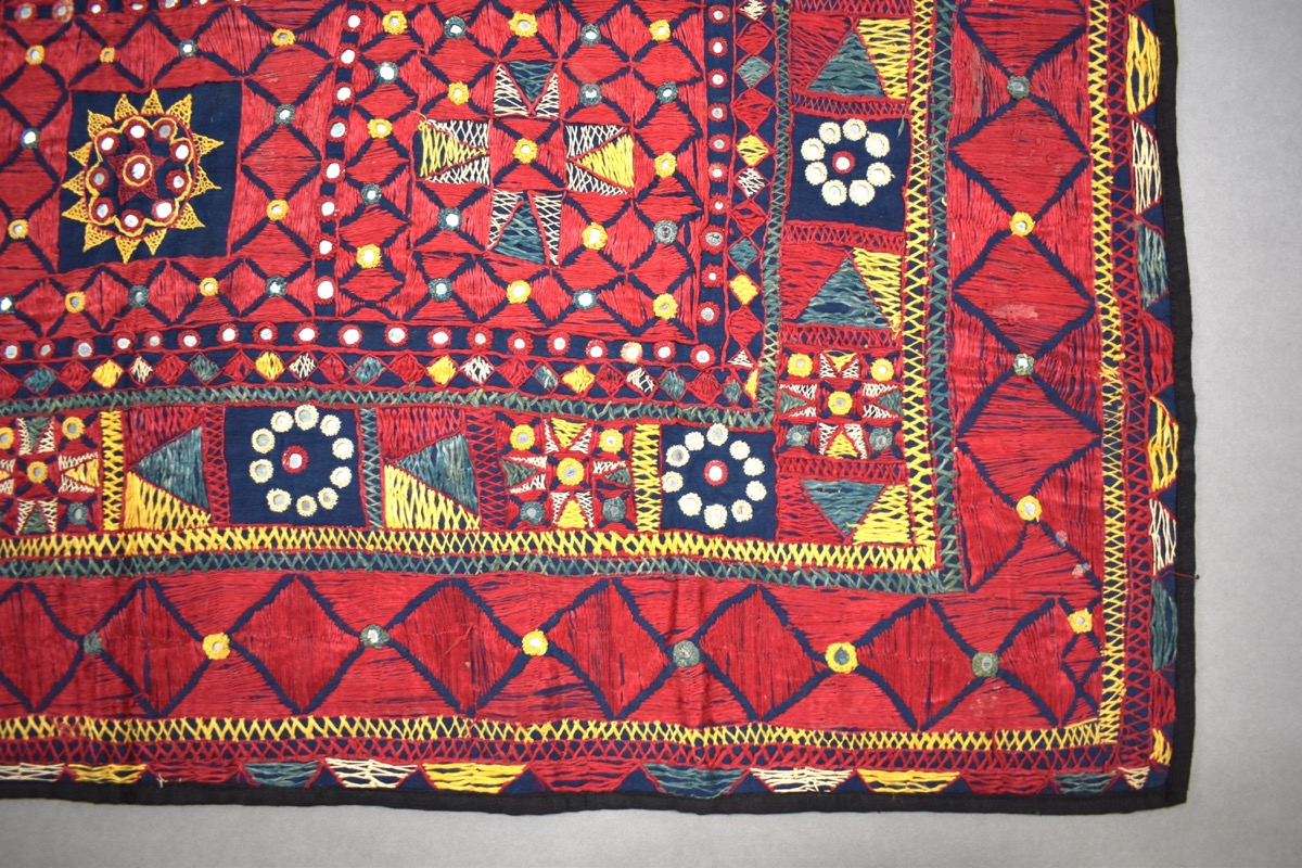 Square textile. Mostly red embroidery on blue woven textile. Decorated with geometric designs based on squares and lozenges. Multicoloured (breen, blue, yellow, white, red). Dozens of small, circular mirrors inlaid. Black hem all around.