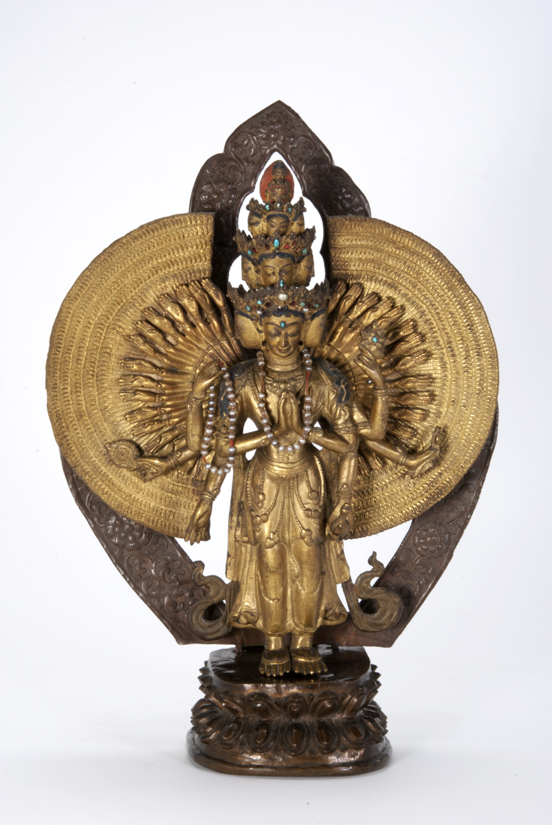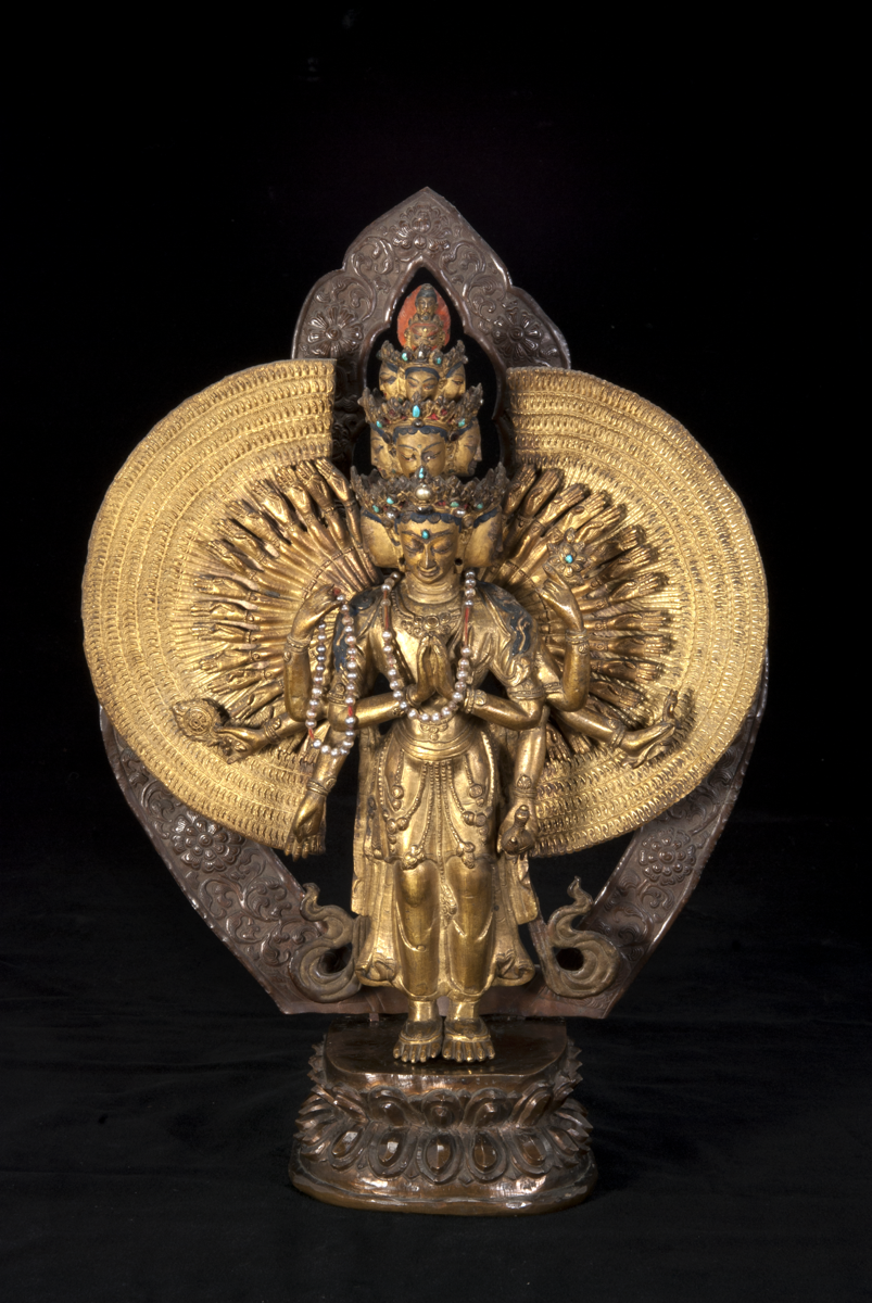 Catalogue Card: “11 headed Avalokita / According to legend, in Avalokiteswara’s last incarnation as a Bodhisattva, he became enlightened and ready to become Buddha and enter Nirvana. On his way there he heard weeping and wailing. Turning about he looked down and saw humanity bewailing the fact that he who had helped them with his infinite compassion was about the leave the earth and enter nirvana. Agonised by all this, he mourned so that his head split into pieces. The Dhyani Buddha Amitabha put the pieces together into eleven heads and gave him a thousand arms. Avalokiteswara vowed to remain a Bodhisattva to help suffering humanity and pledged that he would not enter Nirvana till all sentient beings were saved. Avalokiteswara is incarnate in each Dalai Lama.”