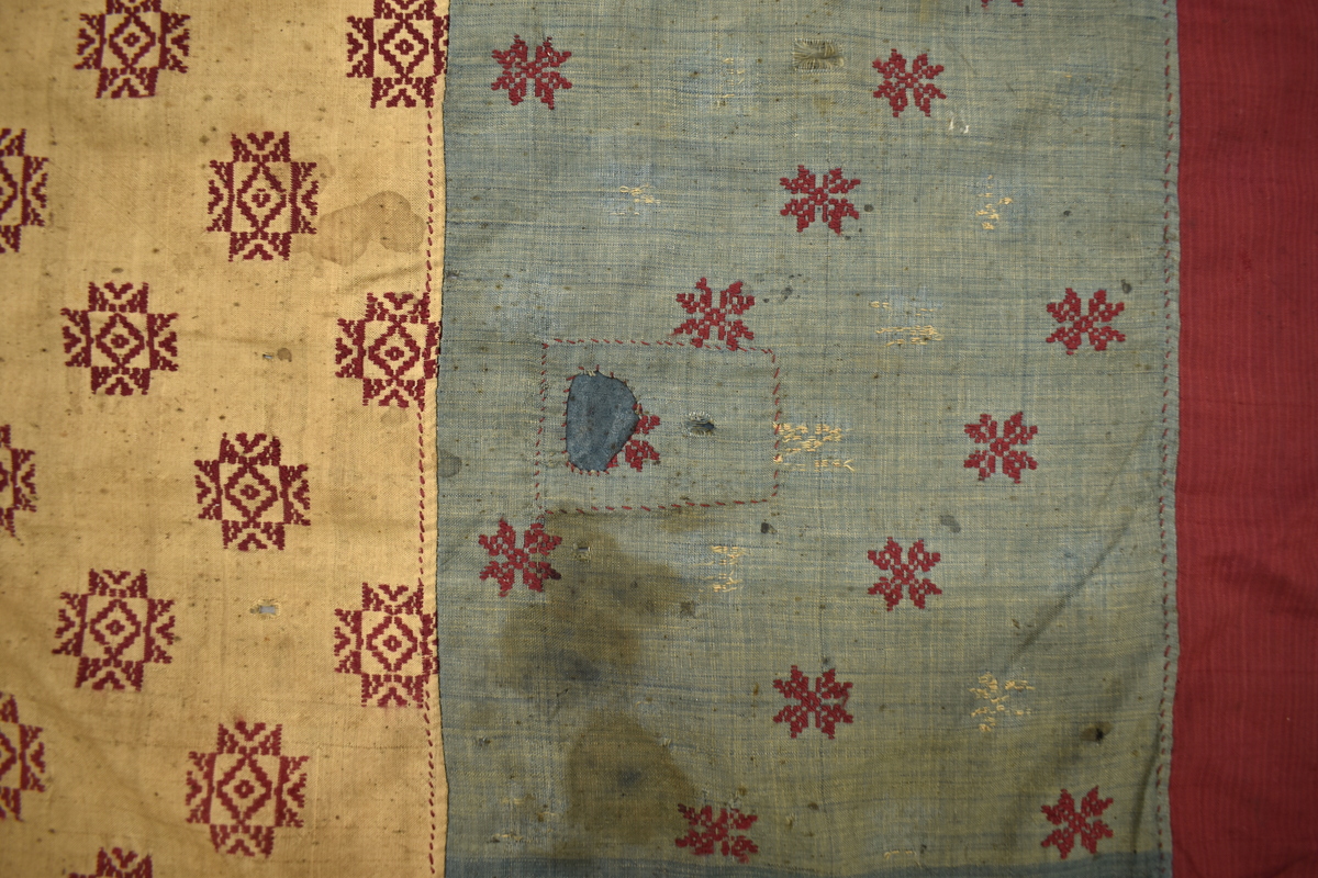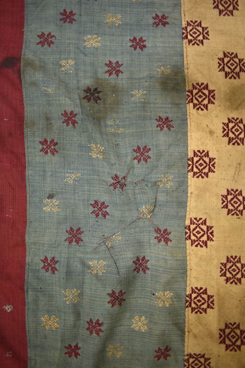 Made up of alternate amber, maroon and blue strips. Each strip is embroidered and hand sewn to the next strip.; Very poor. Holes. Also tears which are pinned together.