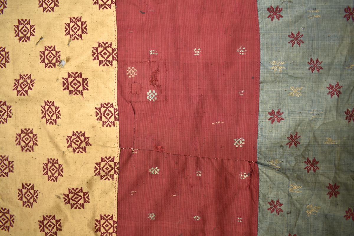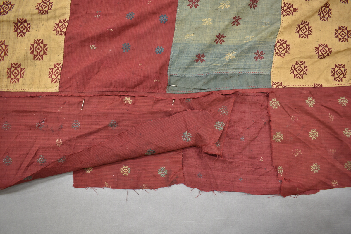 Large patchwork woven textile of silk (?) panels; constructed of 3 main fabrics a red, yellow and blue/green to form a sari or large drape; item appears unfinished - still pinned and tacked in places.