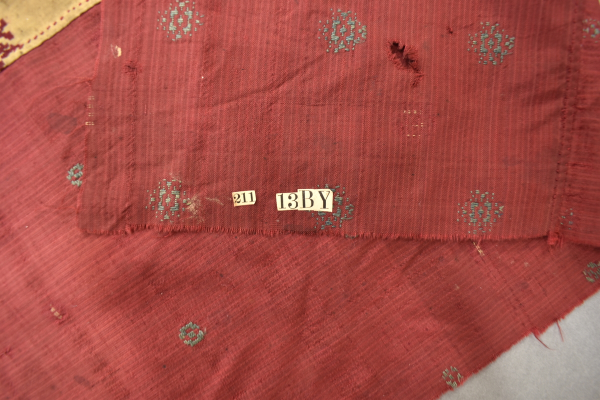 Two old paper labels stuck to the inside of the cloth read: "211" and "13BY".