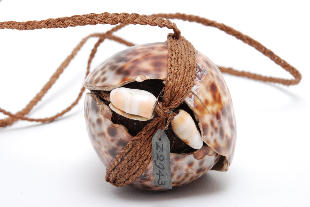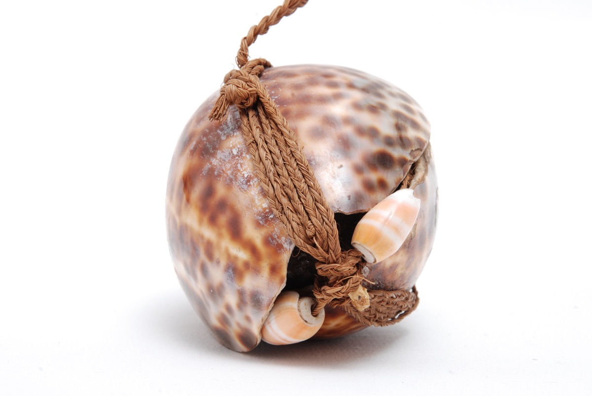 A large circular stone placed in the centre and enclosed in two halves of tiger cowries shells. The object is tied together with 3 ply plaited coir. Two smaller shells are attached to both ends of the object. A small piece of cane sticks out from one of the ends.