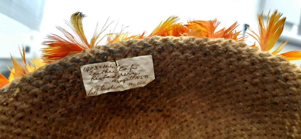 Examined by Anita Herle and Rosa Dyer (a AHRC CDP doctoral student at the Pitt Rivers Museum/ Birkbeck University) on 31 Jan 2024. Rosa's research focuses on the use of feathers in objects made by South American Indigenous peoples. The crown of the headdress is covered with parrot feathers, wrapped and bound into a cotton inner cap made with a tight spiral weave. Many of the yellow/gold feathers were produced by tapirage. The side tassels are composed of the red breast feathers of a parrot, with black curassow feathers at the bottom. The long feathers at the back are a combination of scarlet macaw (yellowish on reverse) and blue and yellow macaw. Tassels of black curassow feathers hang from the bottom of the macaw feathers.