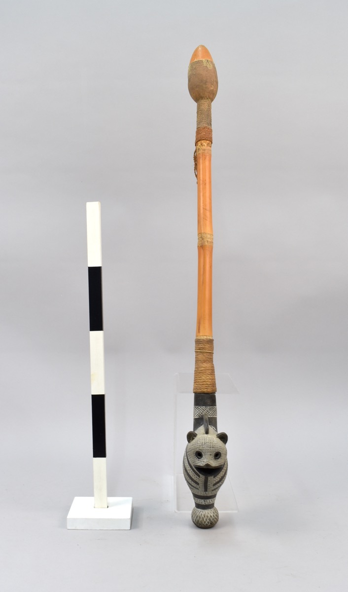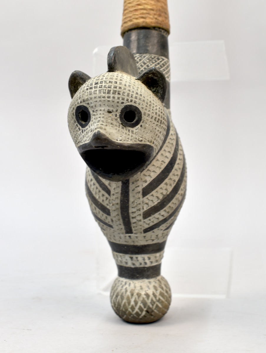 Tobacco pipe. Consists of a cane shank with a ceramic bowl attached to one end, and a gourd mouthpiece attached to the other end. Bowl and gourd are connected to stem with pieces of hide; fibre string is wrapped around the shank at multiple points. Bowl is modelled in the shape of an animal, possibly a hyena; the animal has two ears, a central ridge along the top of the head, and a wide open mouth; the animal body is decorated with black and white stripes and incised patterns. Bowl previously broken and repaired.