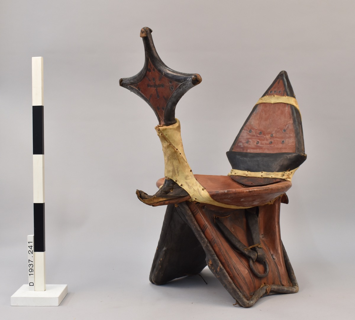 A camel saddle, made from a round wooden seat on top of a triangular frame, all covered in red and brown leather, decorated with black linear patterns. On top of the seat is a diamond shaped peak at the front, decorated with a cross and dots, and triangle peak at the back with dots, both covered in white hide strapping. Black leather straps on both side of the frame, one with an iron ring.